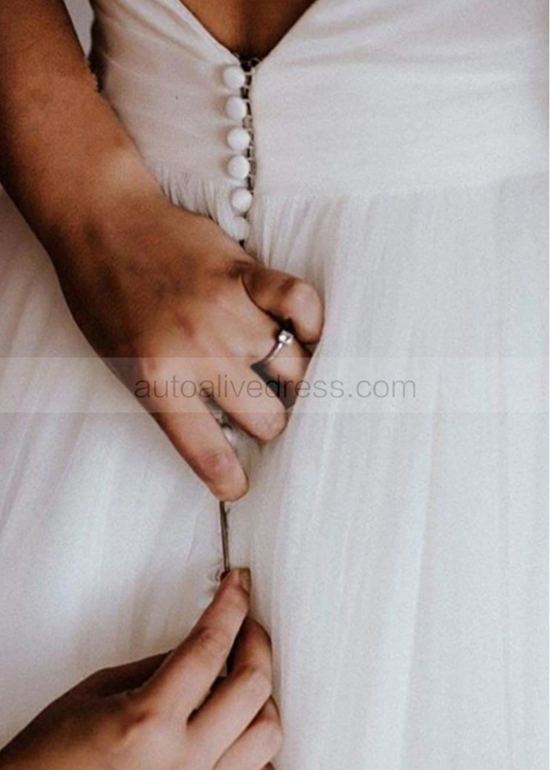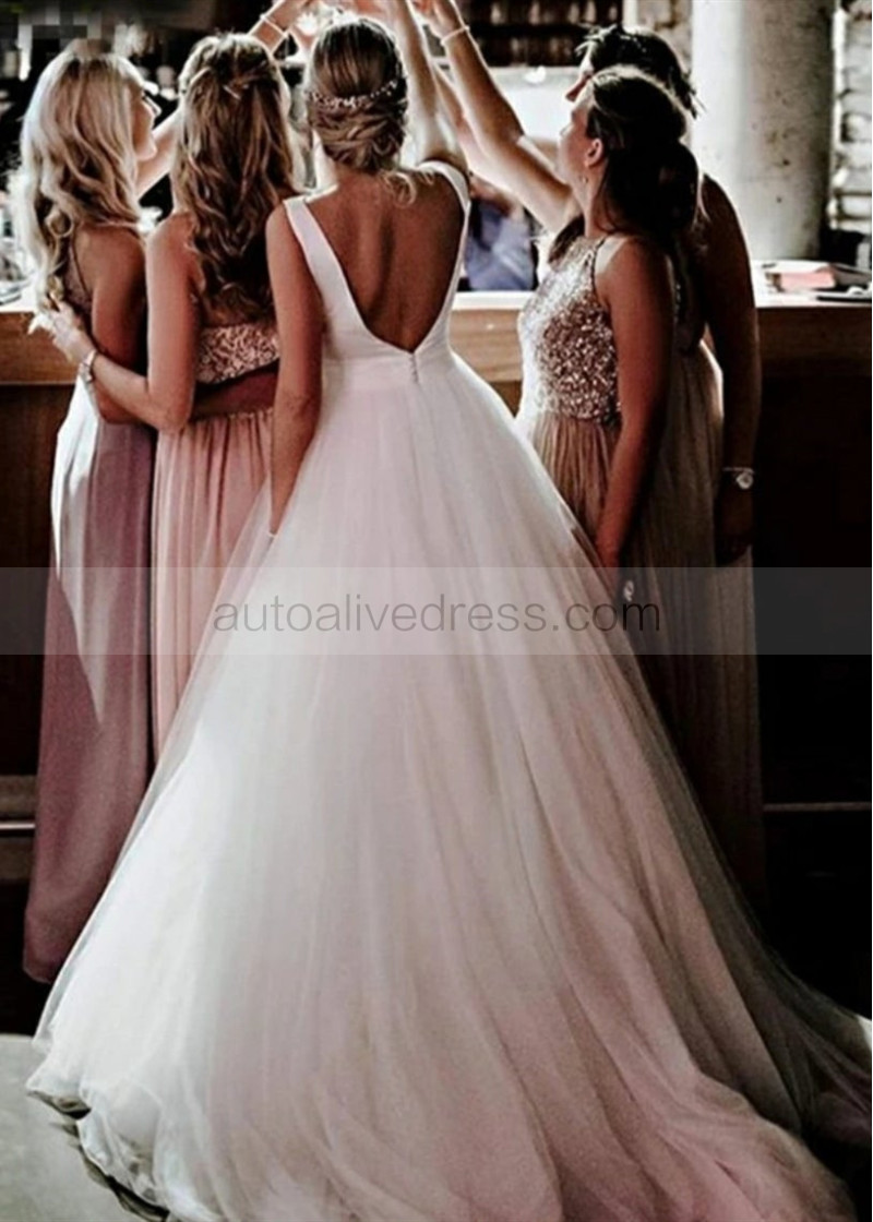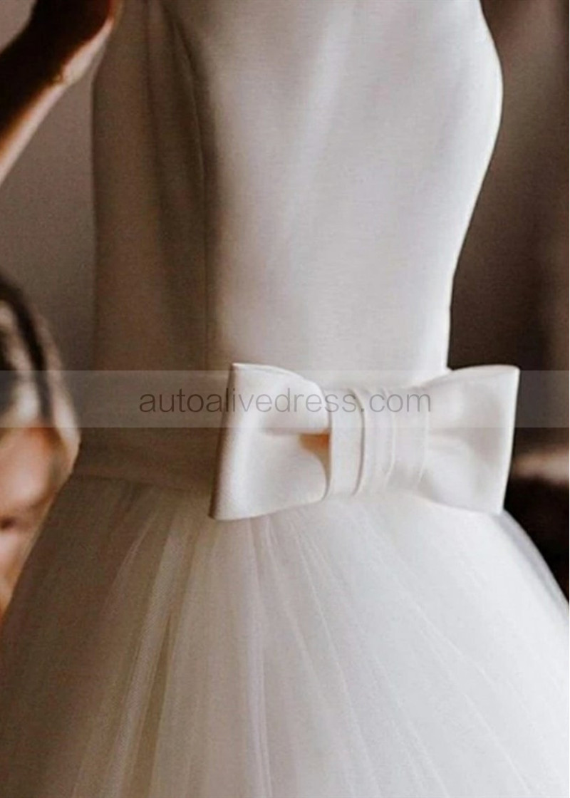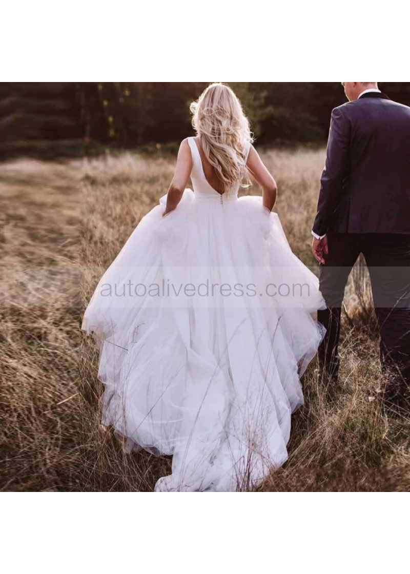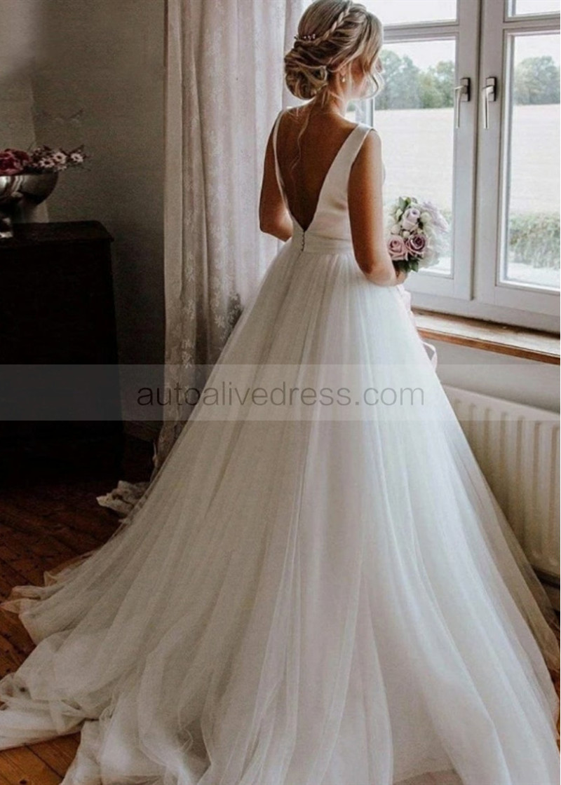 Sleeveless Ivory Satin Tulle V Back Wedding Dress