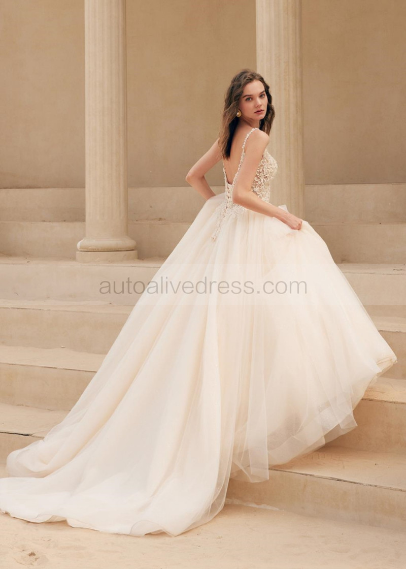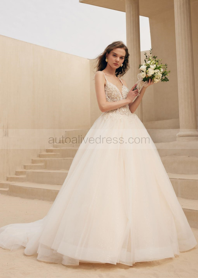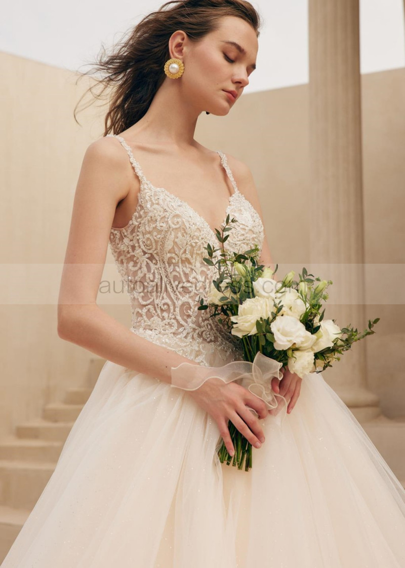 Spaghetti Straps Lace Tulle Corset Back Sparkly Wedding Dress