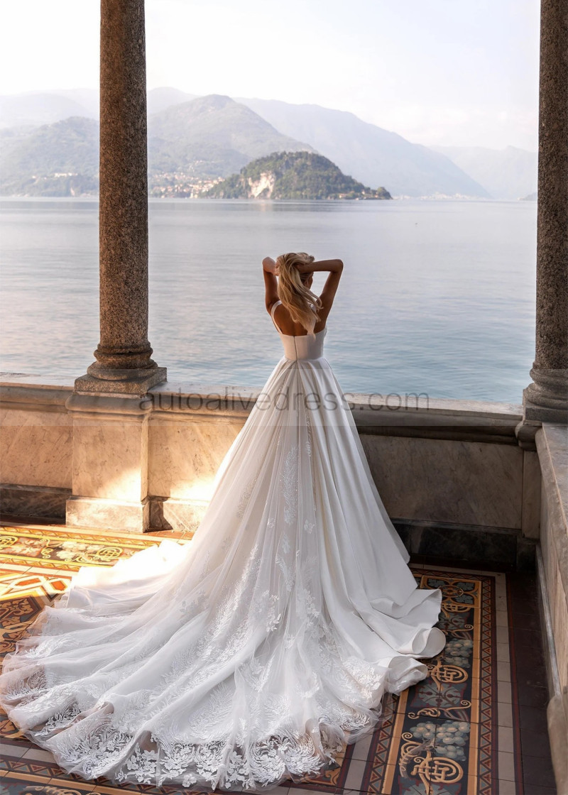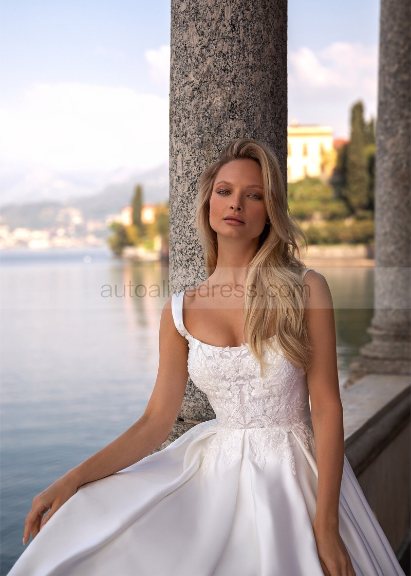 Square Neck Beaded Ivory Lace Satin Royal Wedding Dress