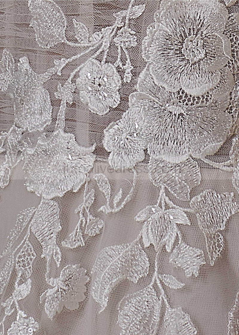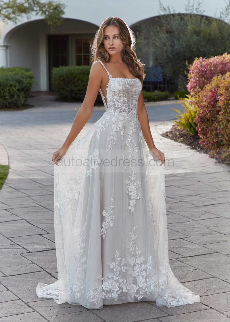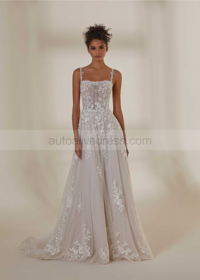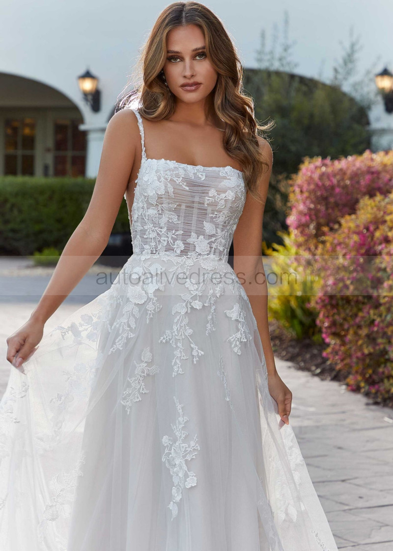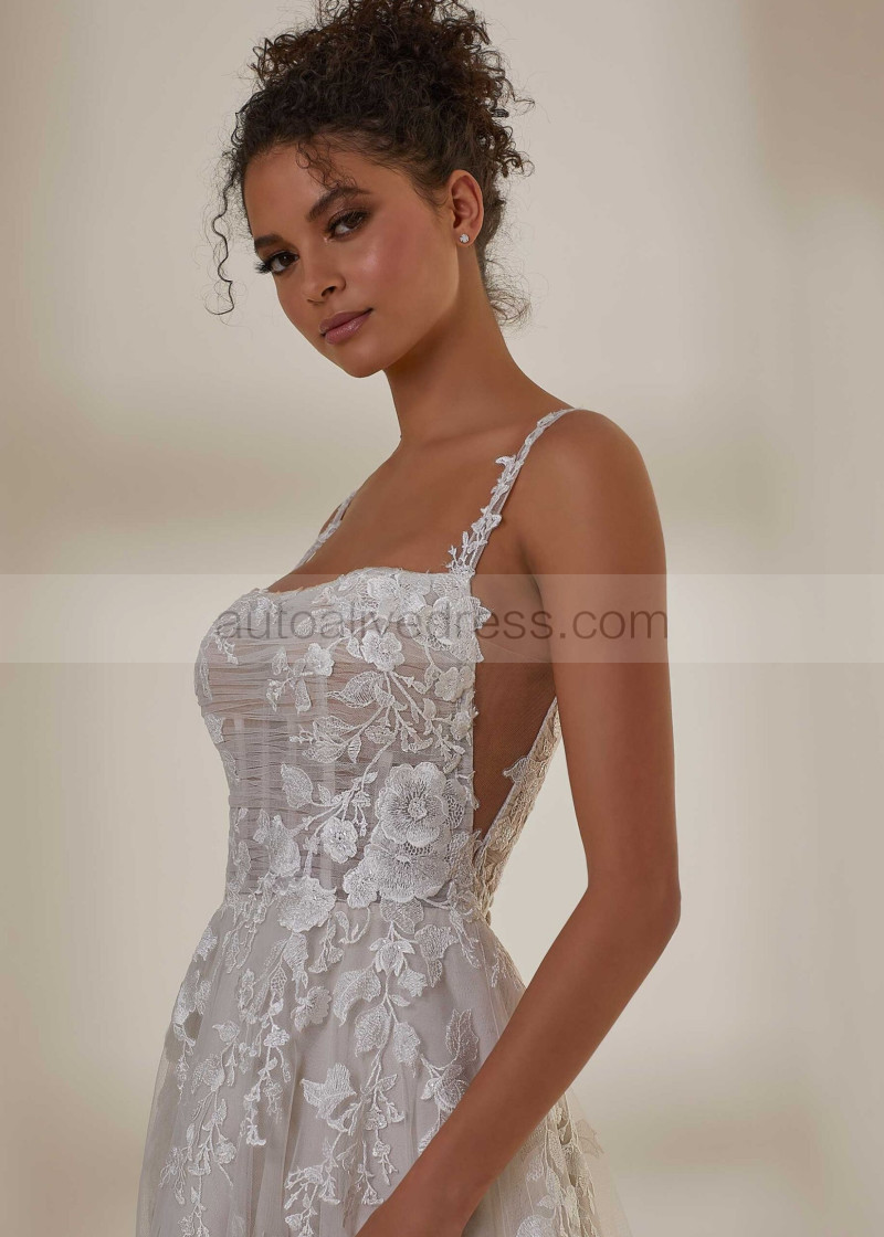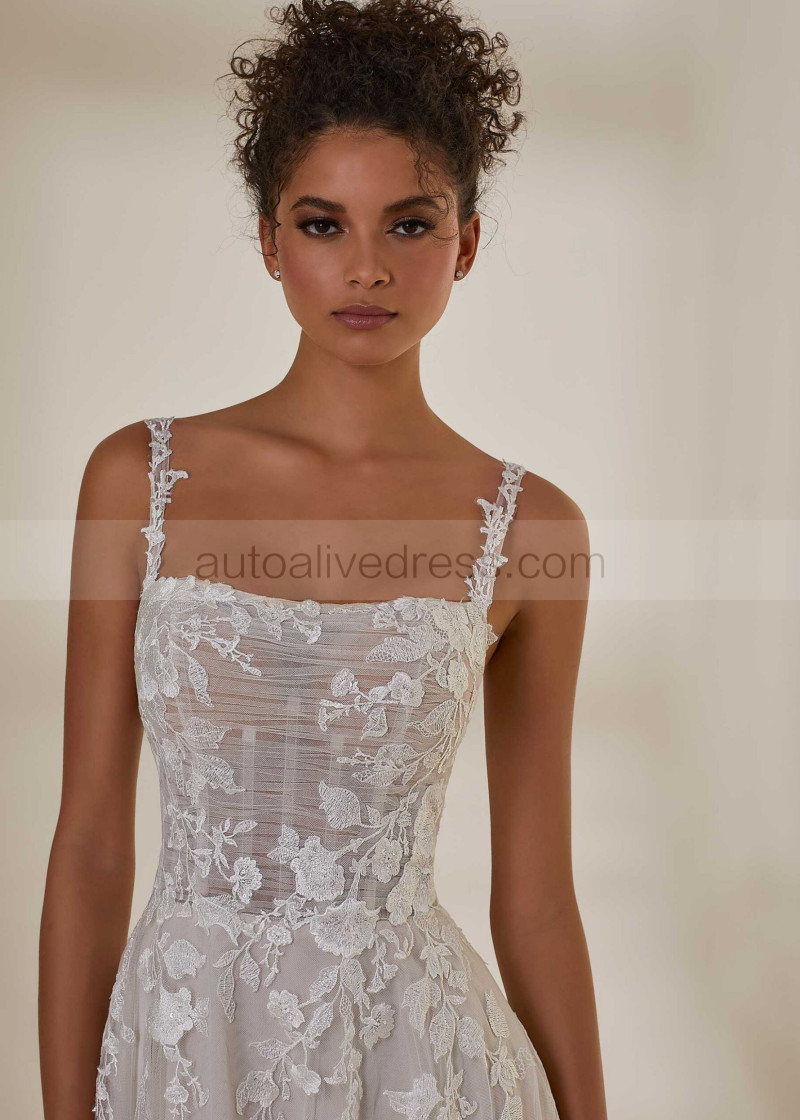Square Neck Ivory Embroidered Lace Tulle Floral Wedding Dress