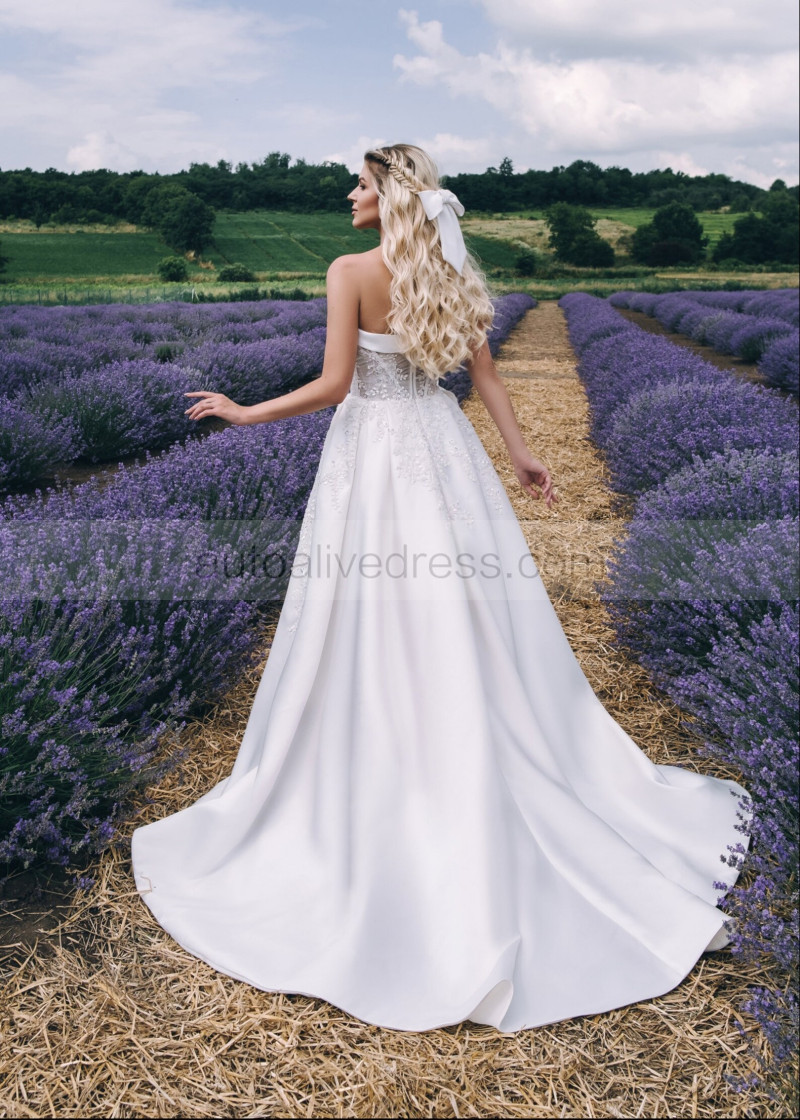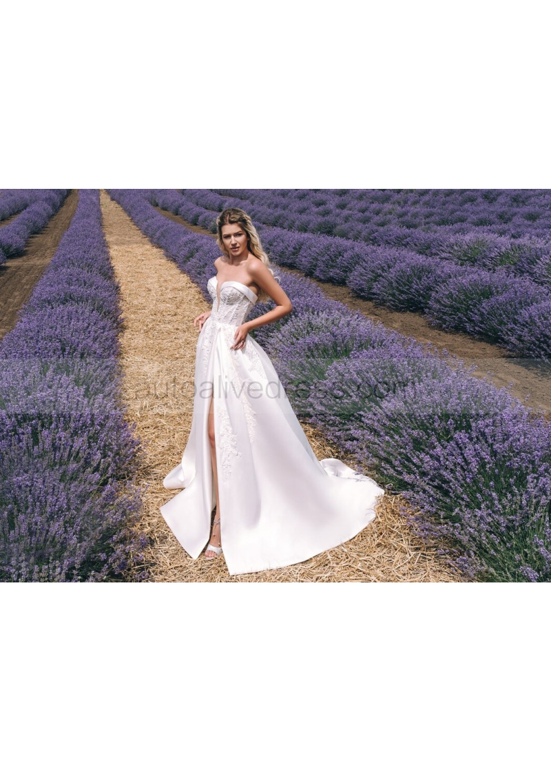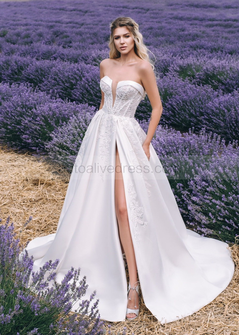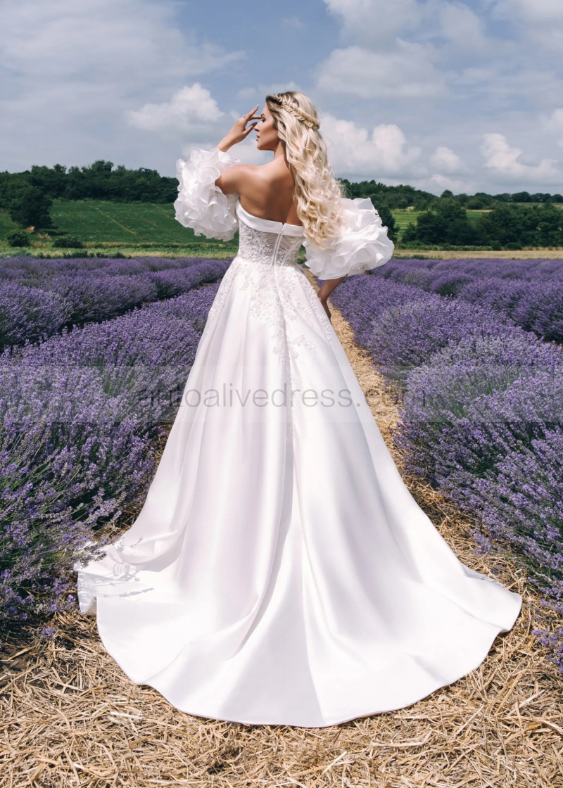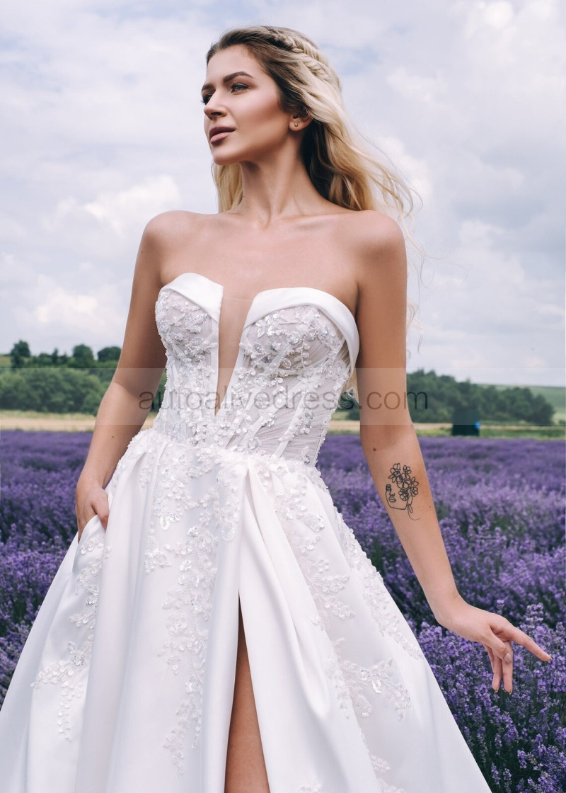Strapless Beaded Ivory Lace Satin Slit Wedding Dress With Ruffled Sleeves