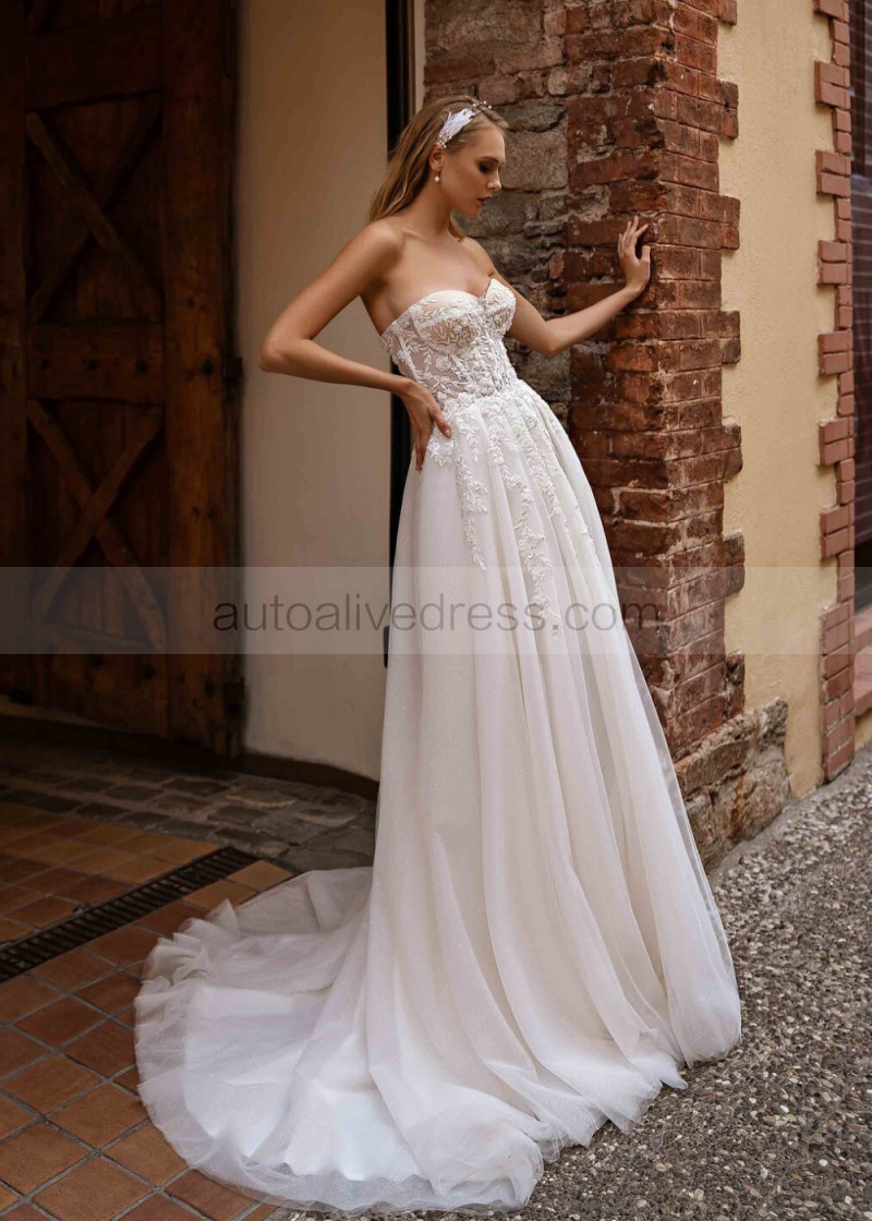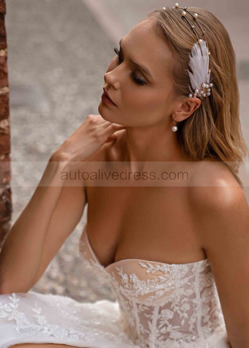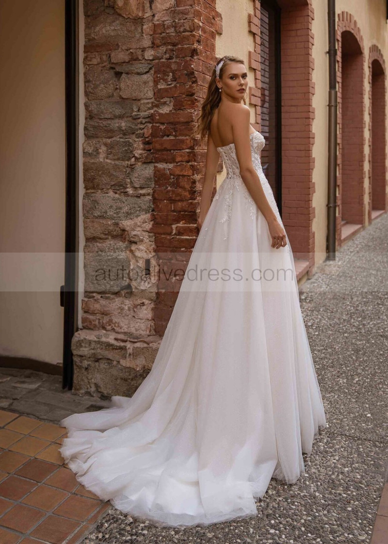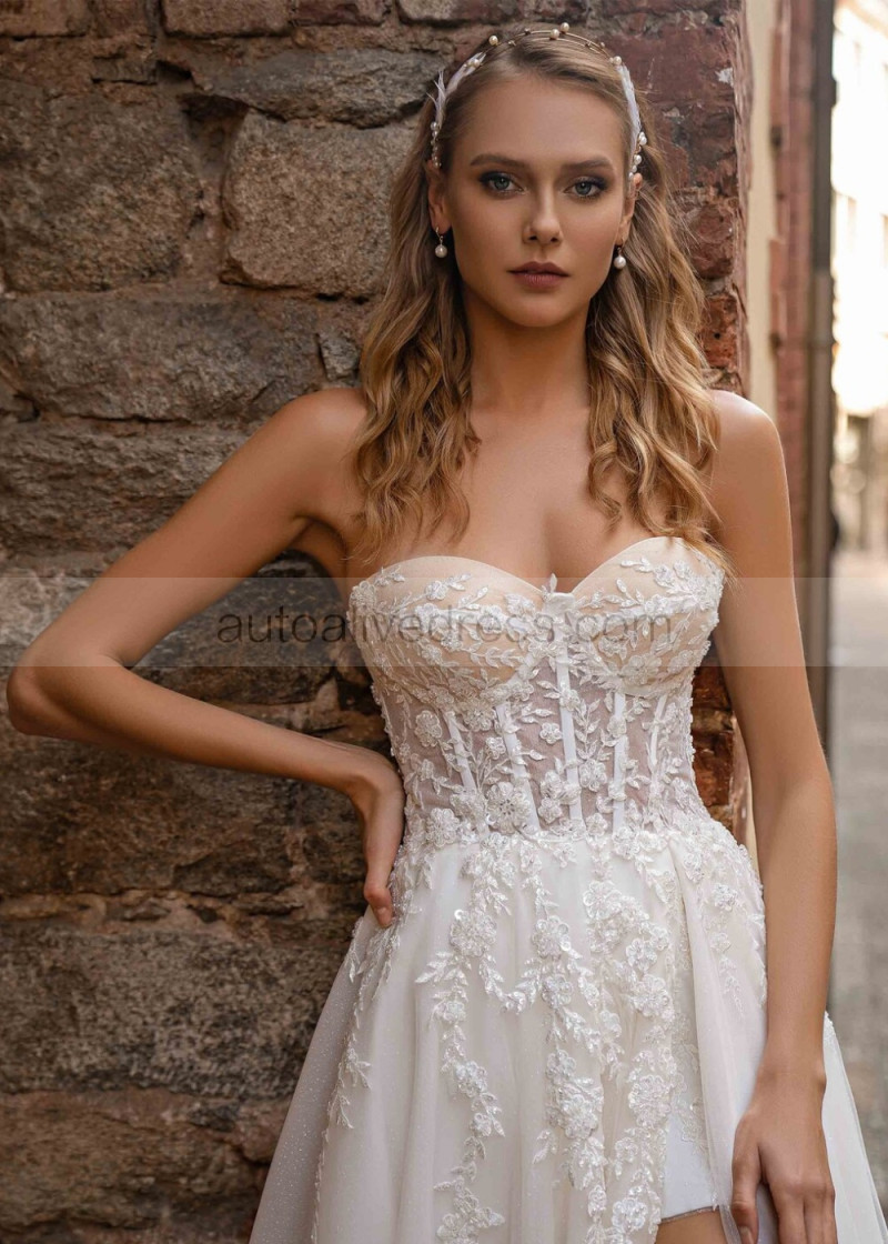 Strapless Beaded Ivory Lace Tulle Slit Sexy Wedding Dress