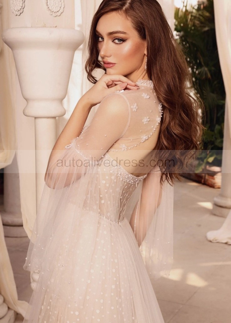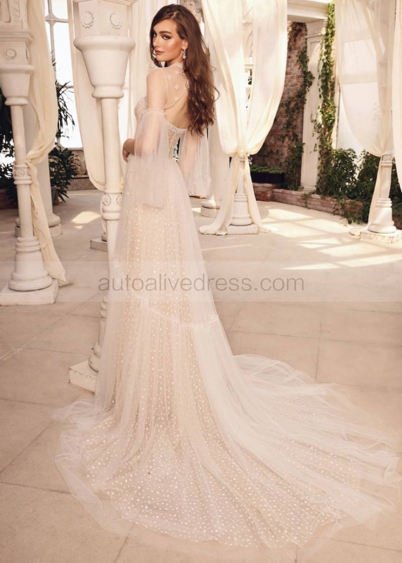 Strapless Beaded Lace Tulle Wedding Dress With Detachable Cape
