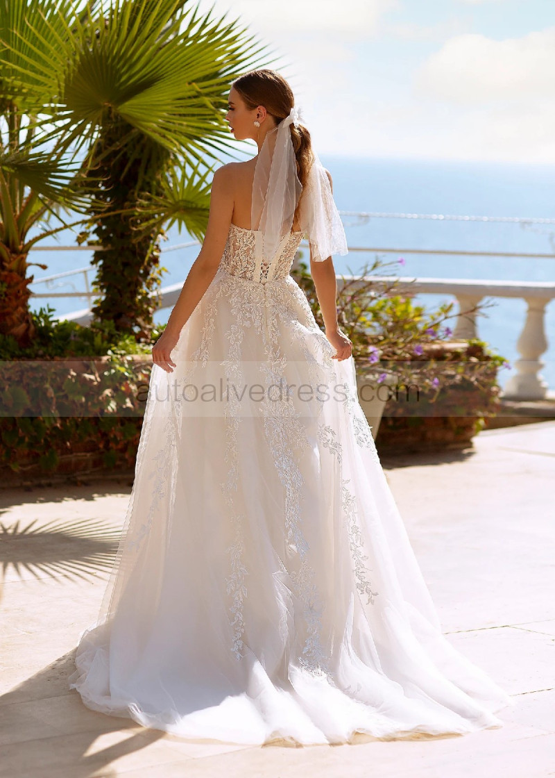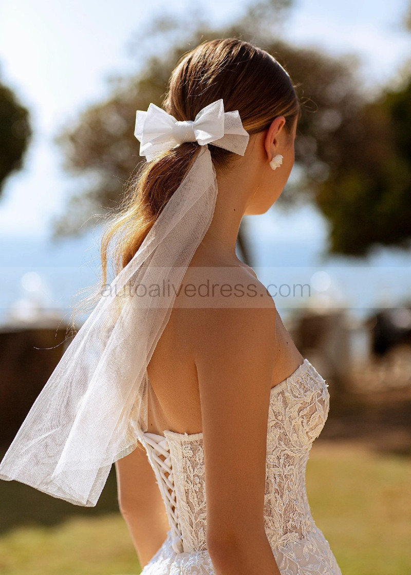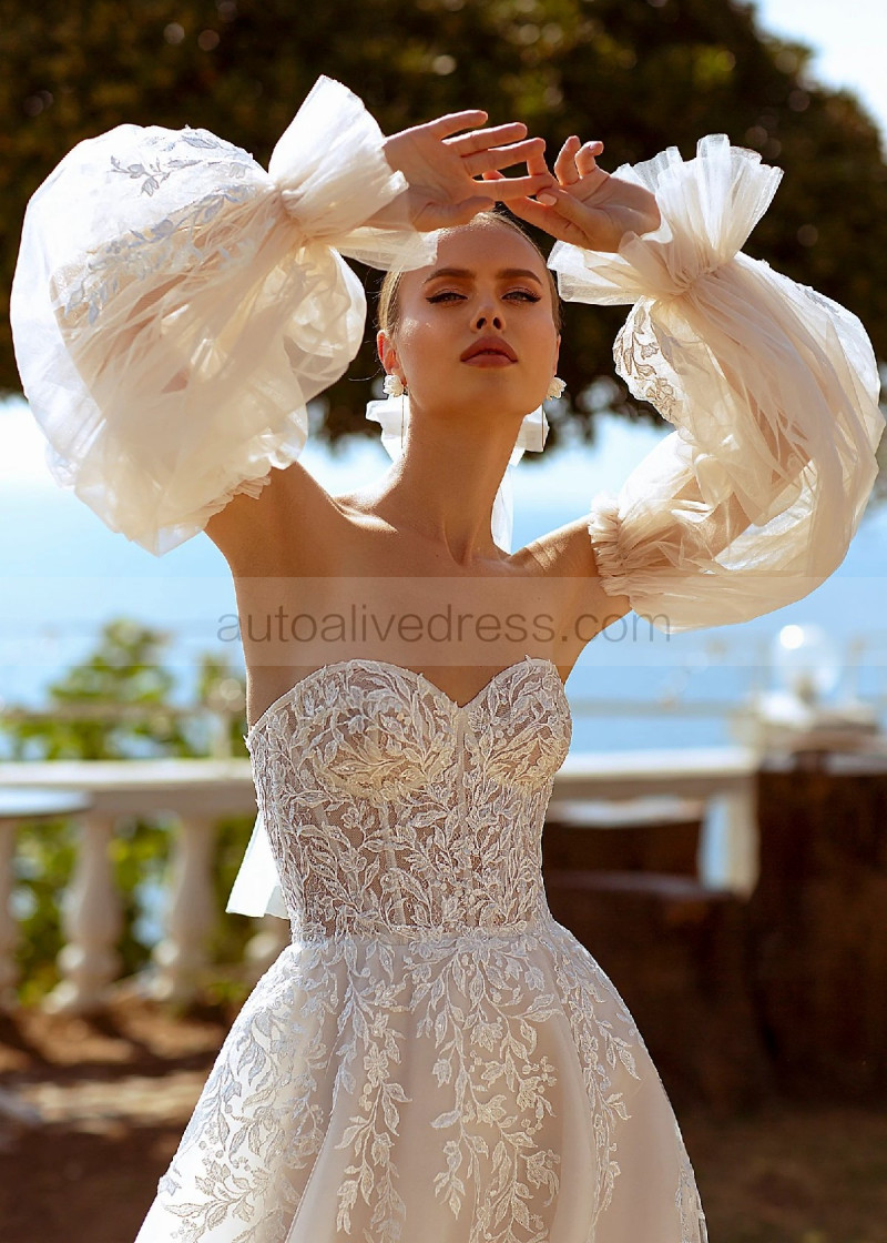Strapless Ivory Lace Tulle Classic Wedding Dress With Detachable Sleeves
