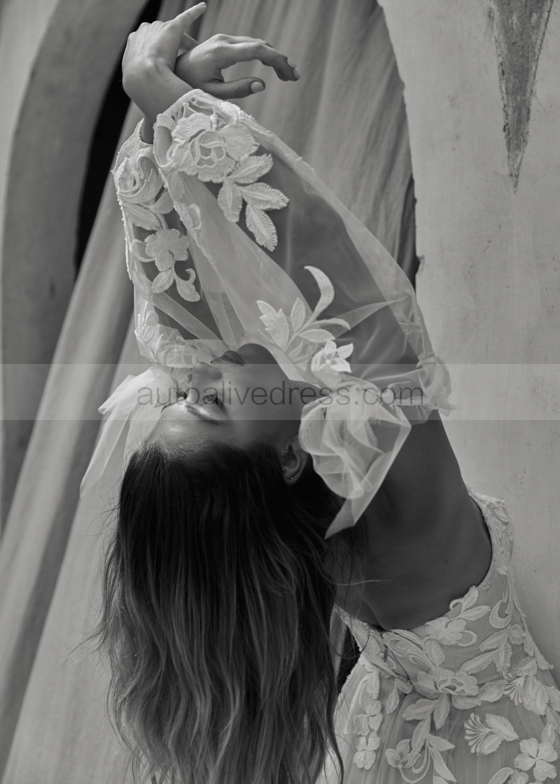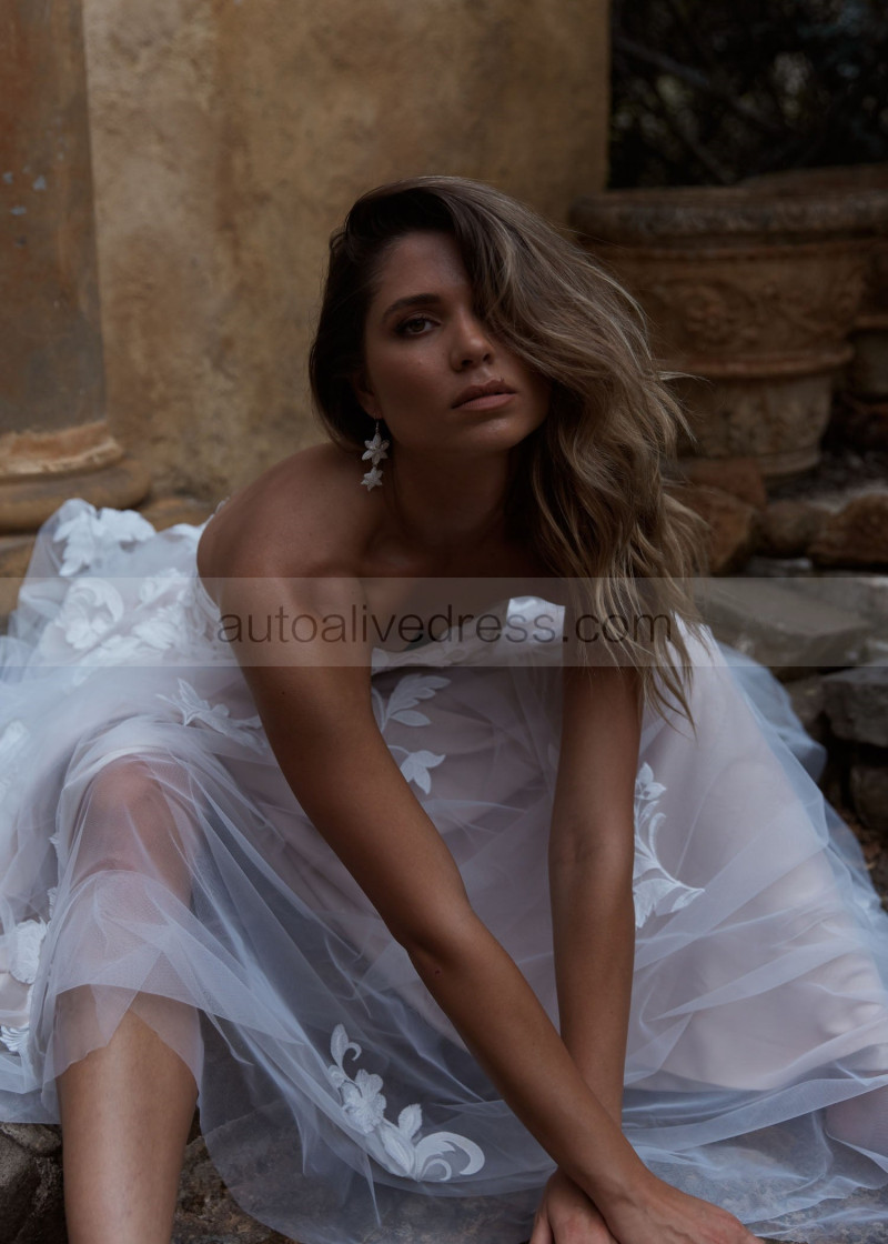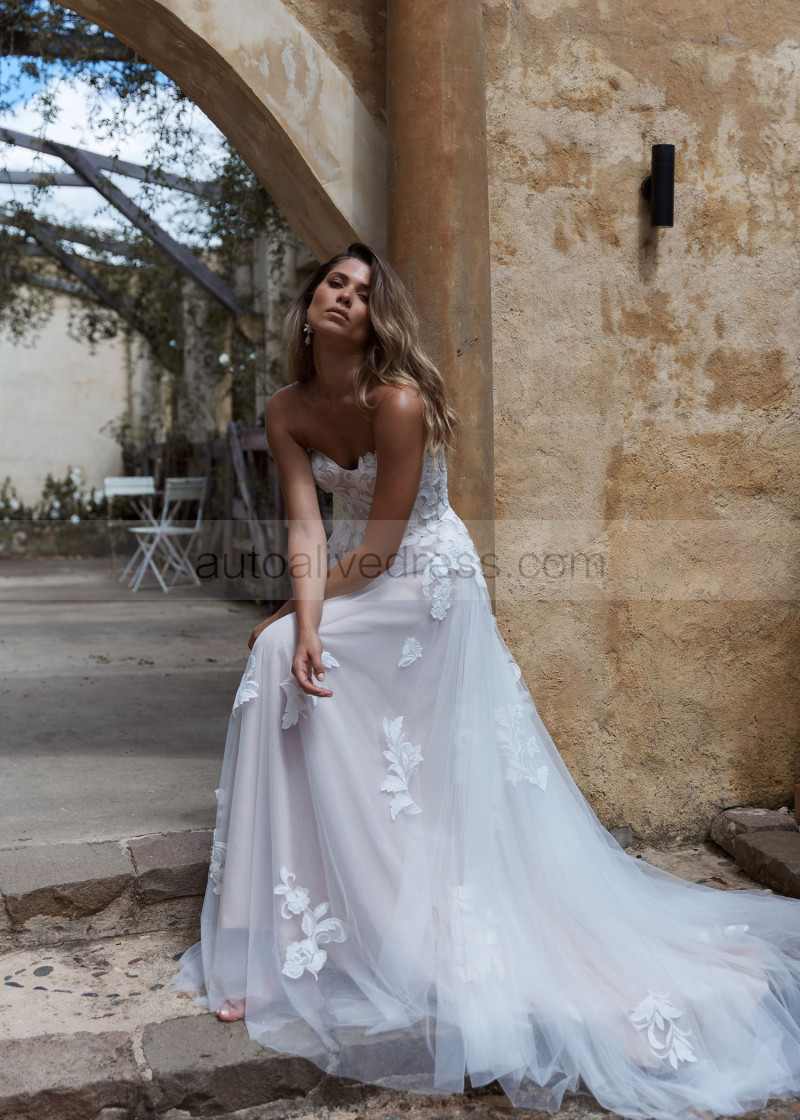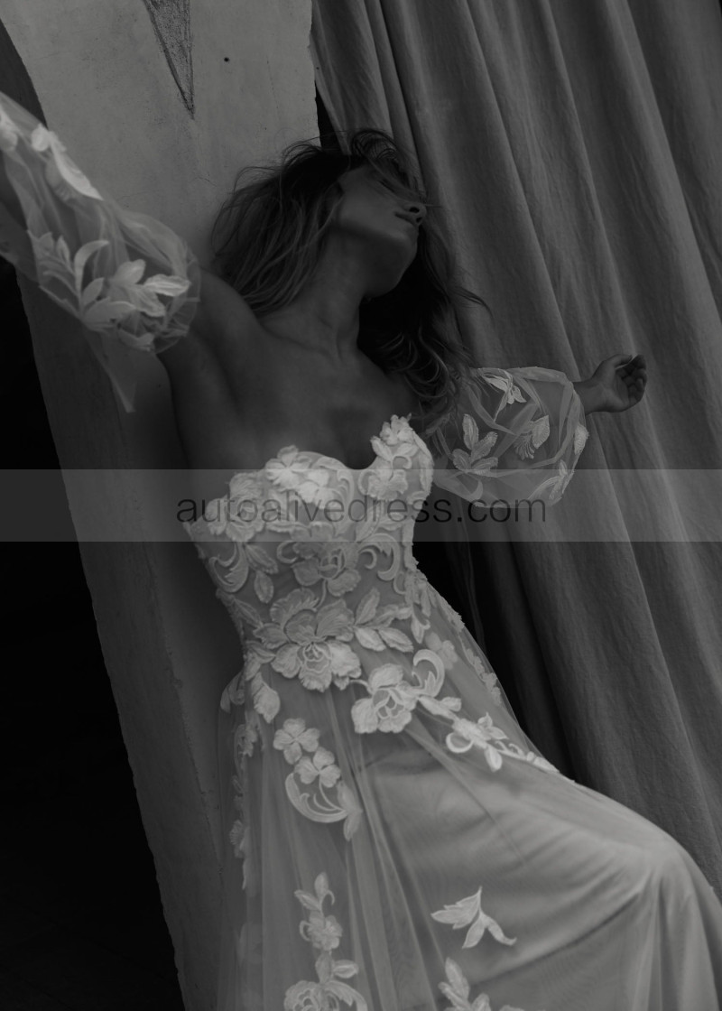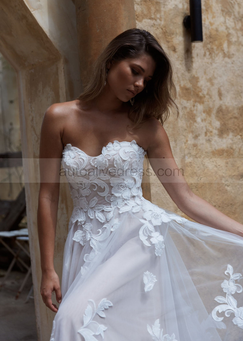 Strapless Ivory Lace Tulle Modern Wedding Dress With Detachable Sleeves
