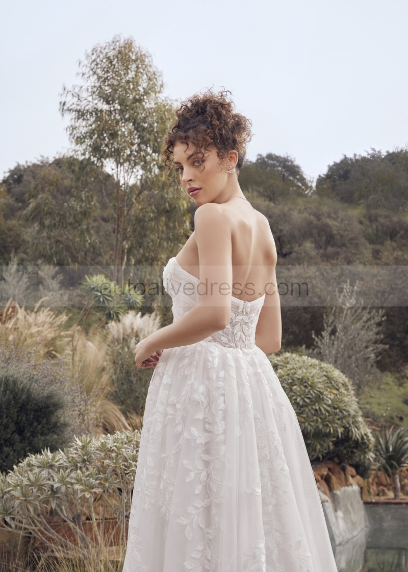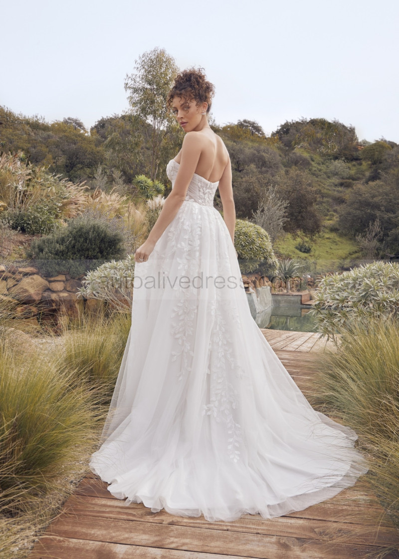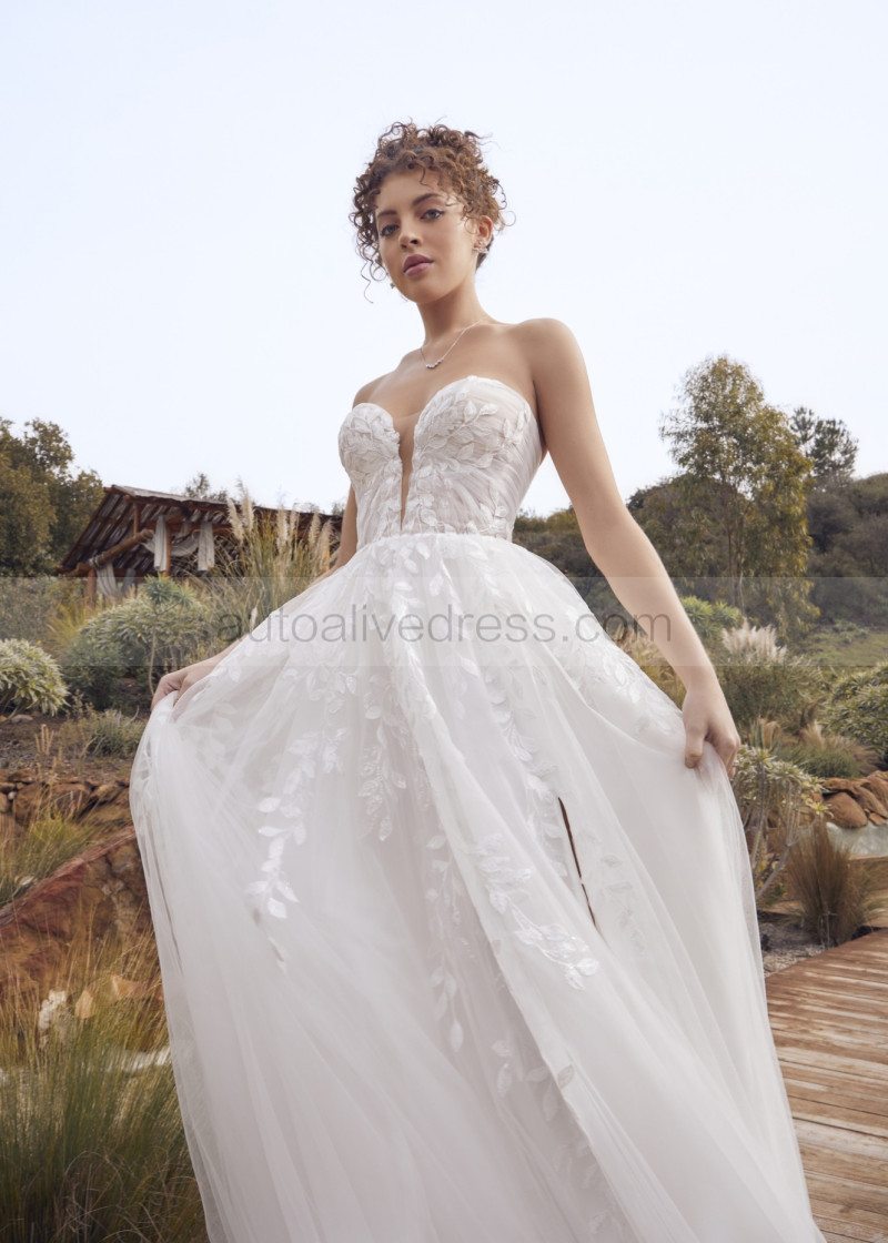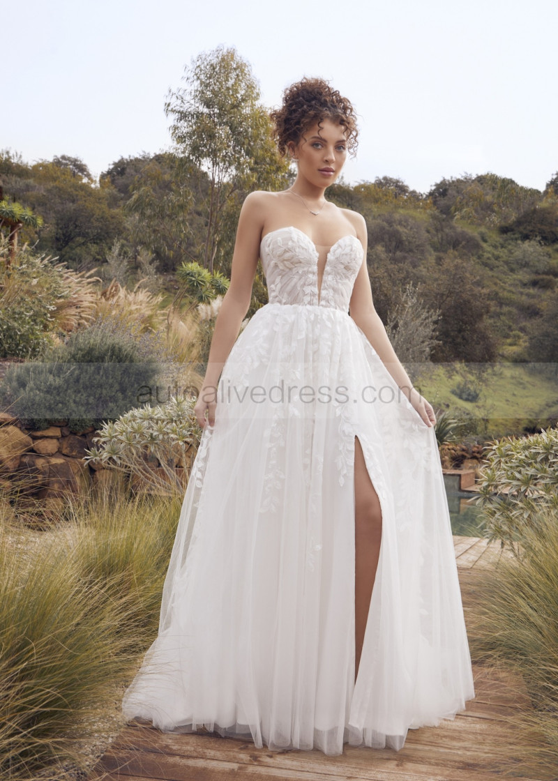 Strapless Ivory Lace Tulle Slit Classic Wedding Dress