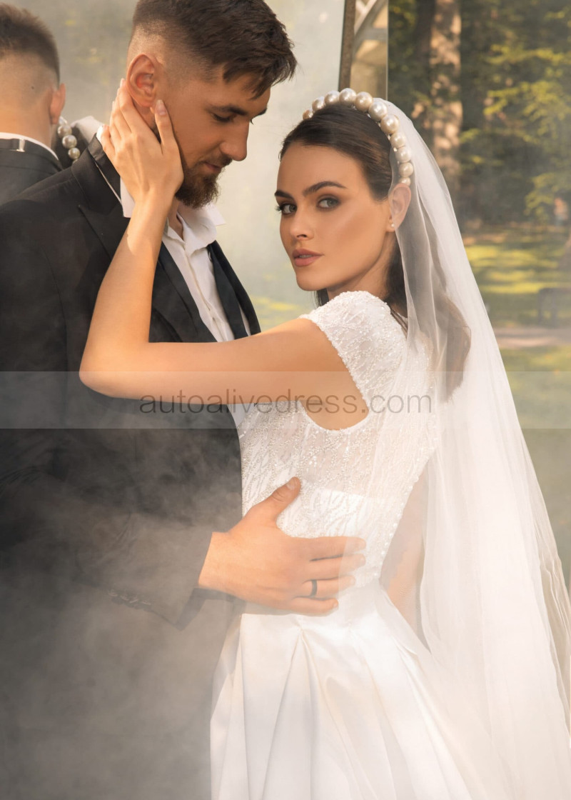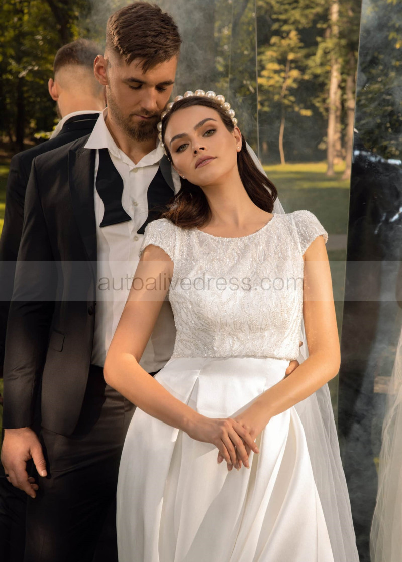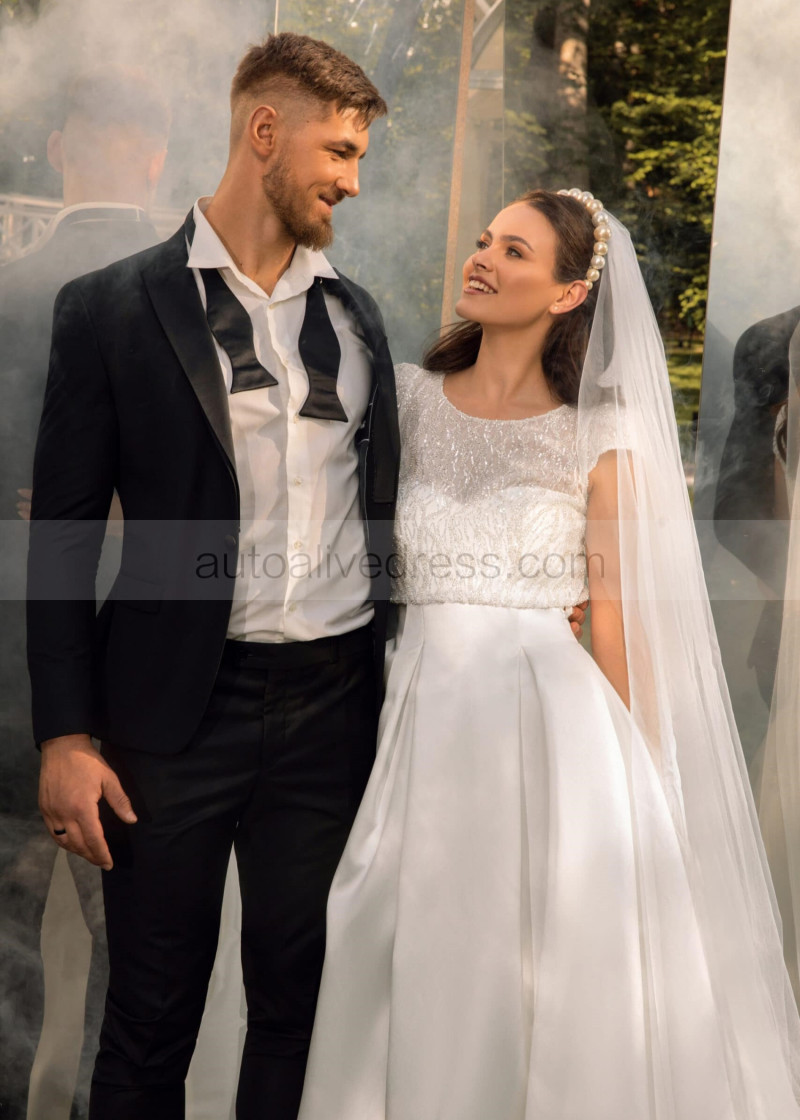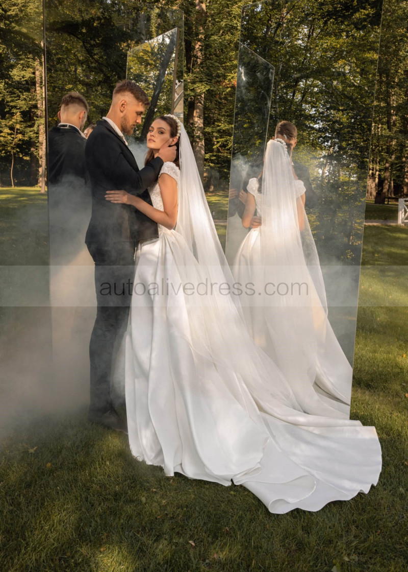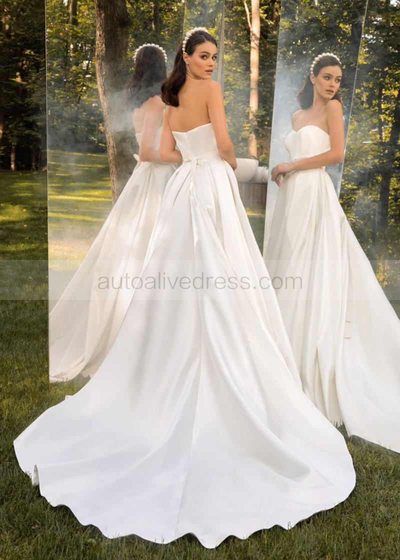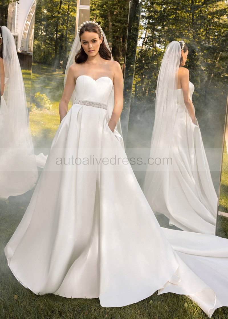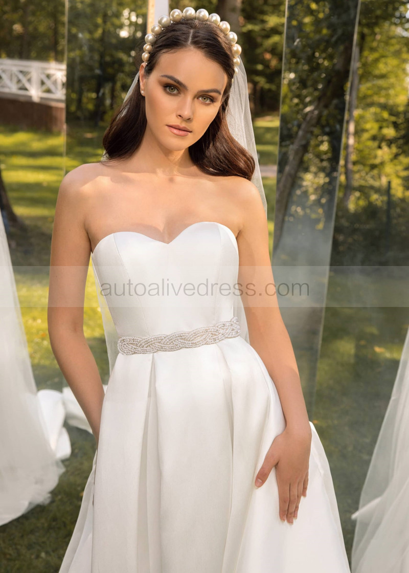 Strapless Ivory Pleated Satin Wedding Dress With Lace Jacket