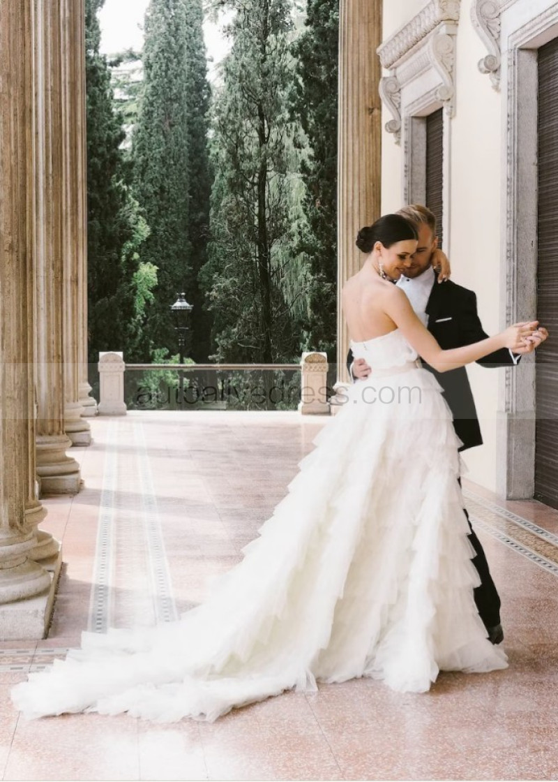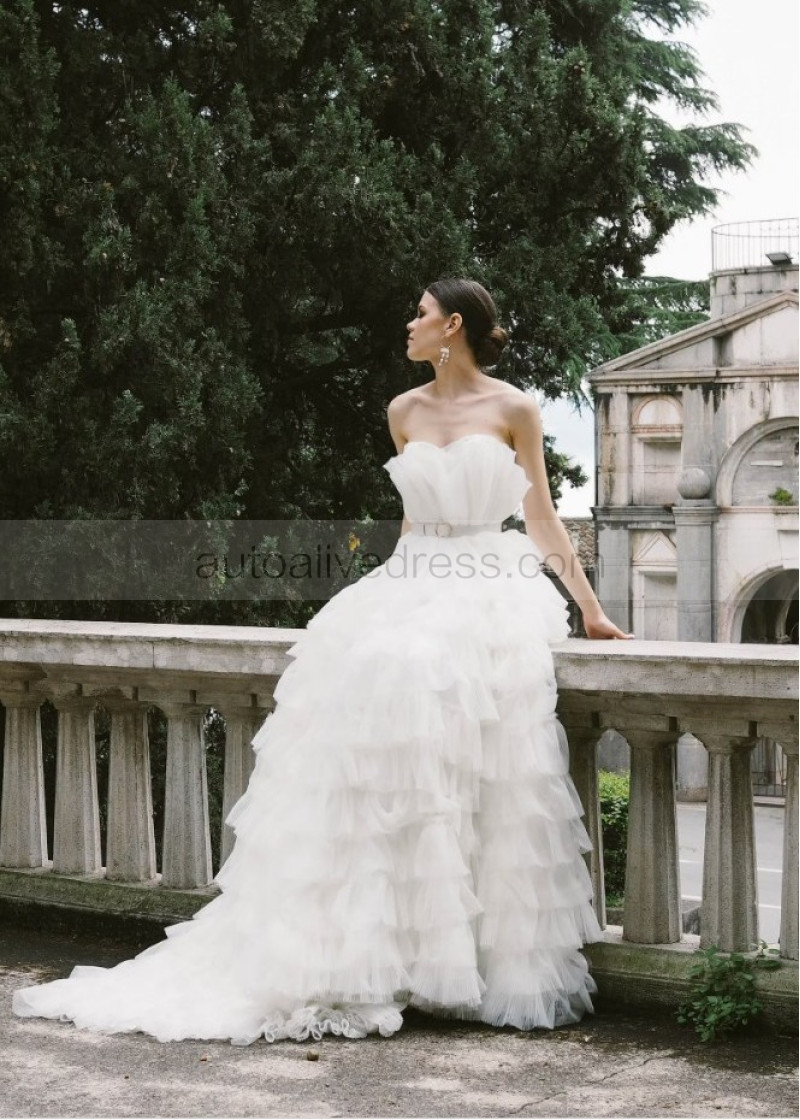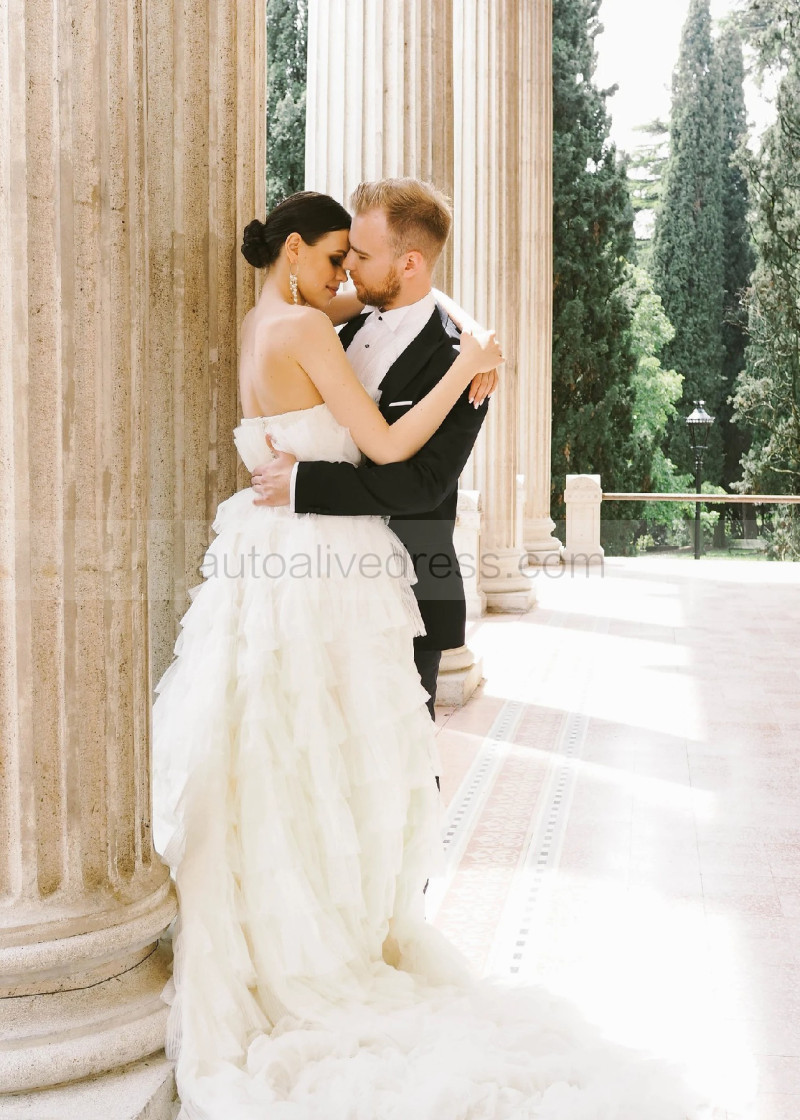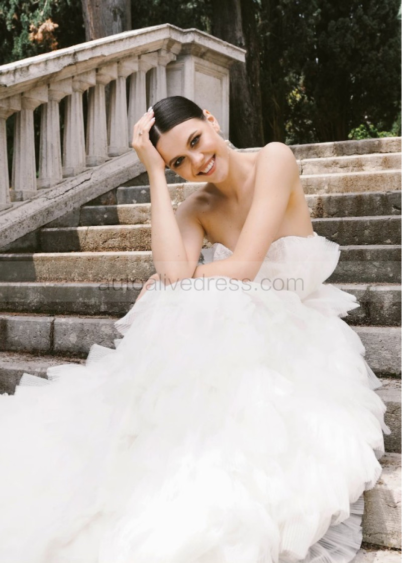 Strapless Ivory Pleated Tulle Ruffled Stunning Wedding Dress