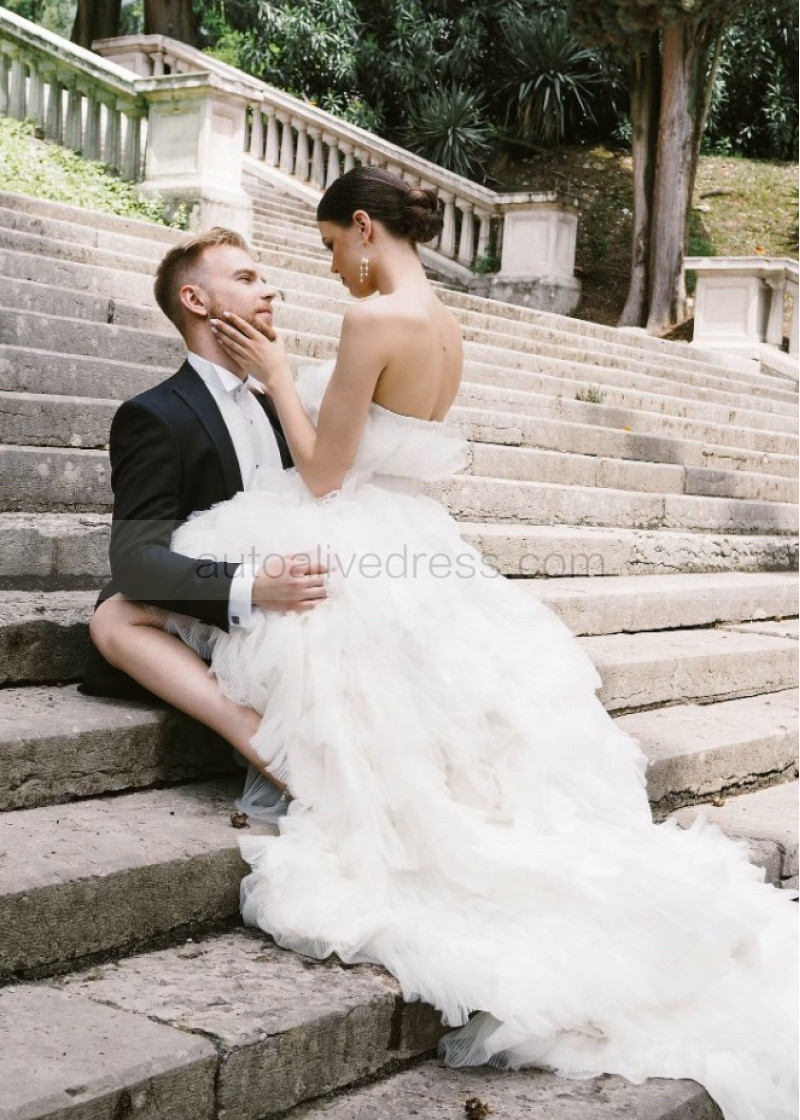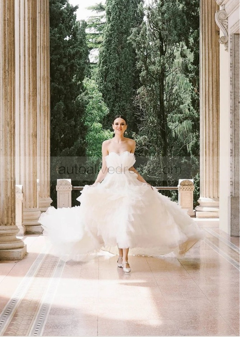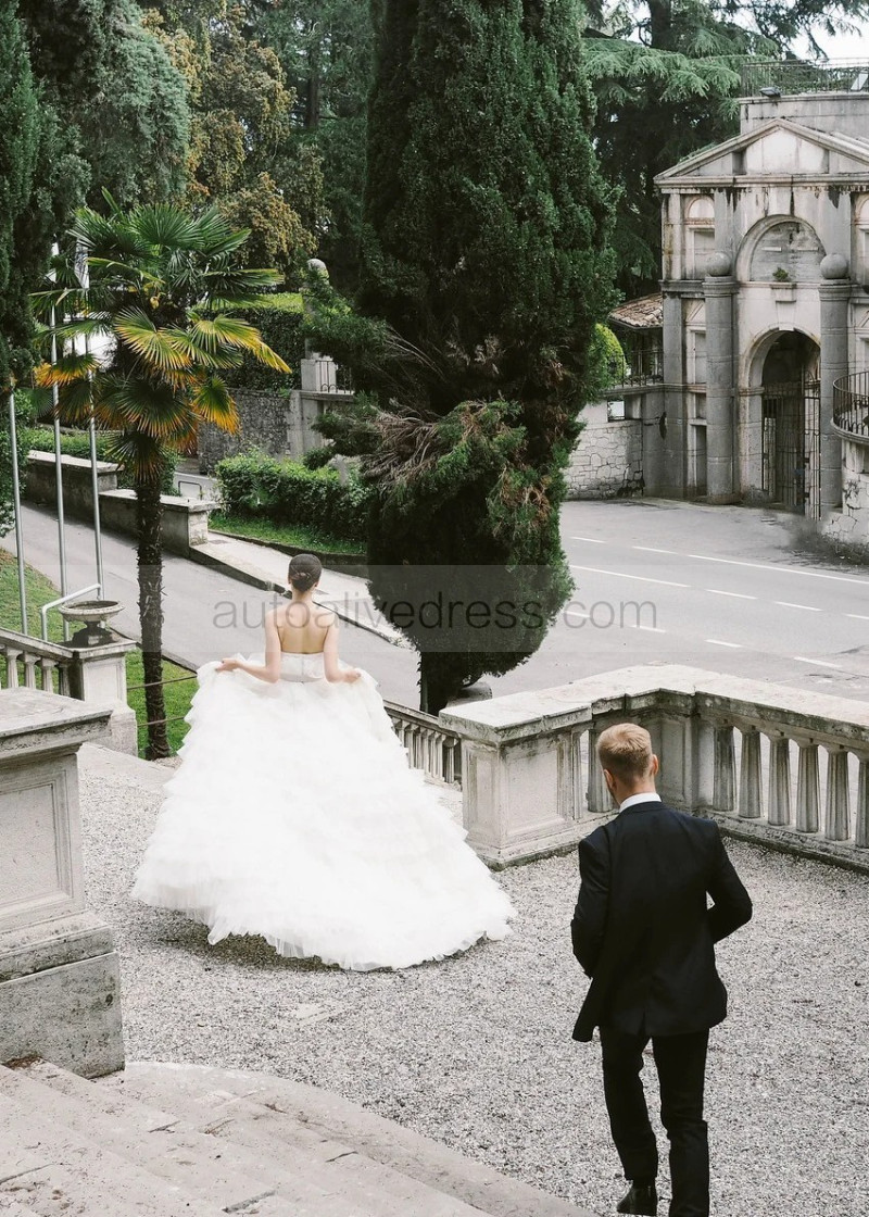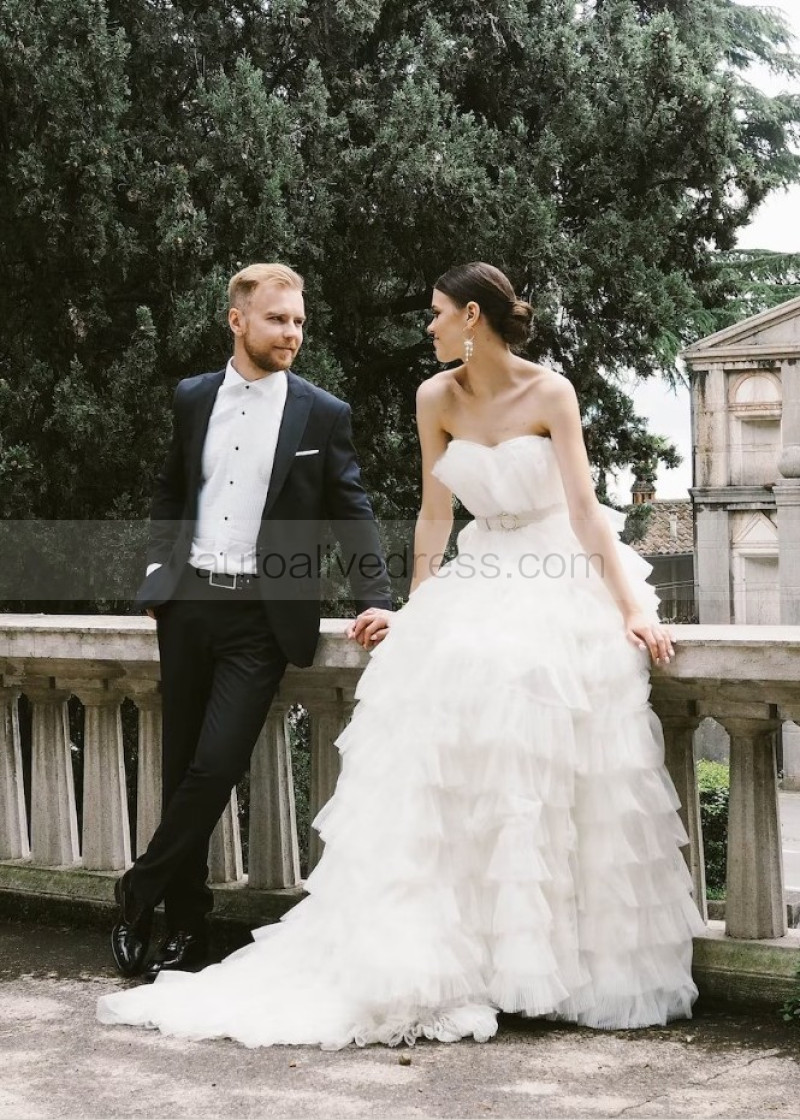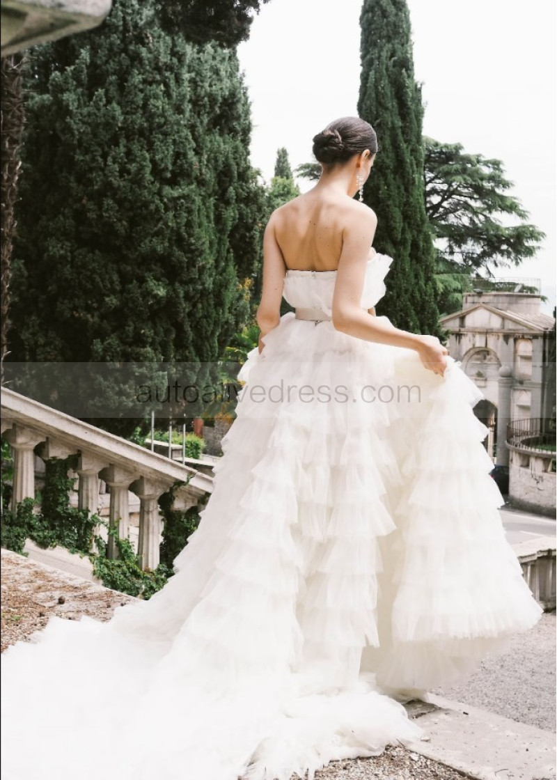 Strapless Ivory Pleated Tulle Ruffled Stunning Wedding Dress