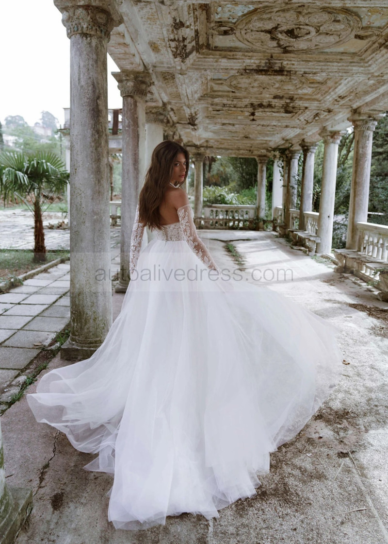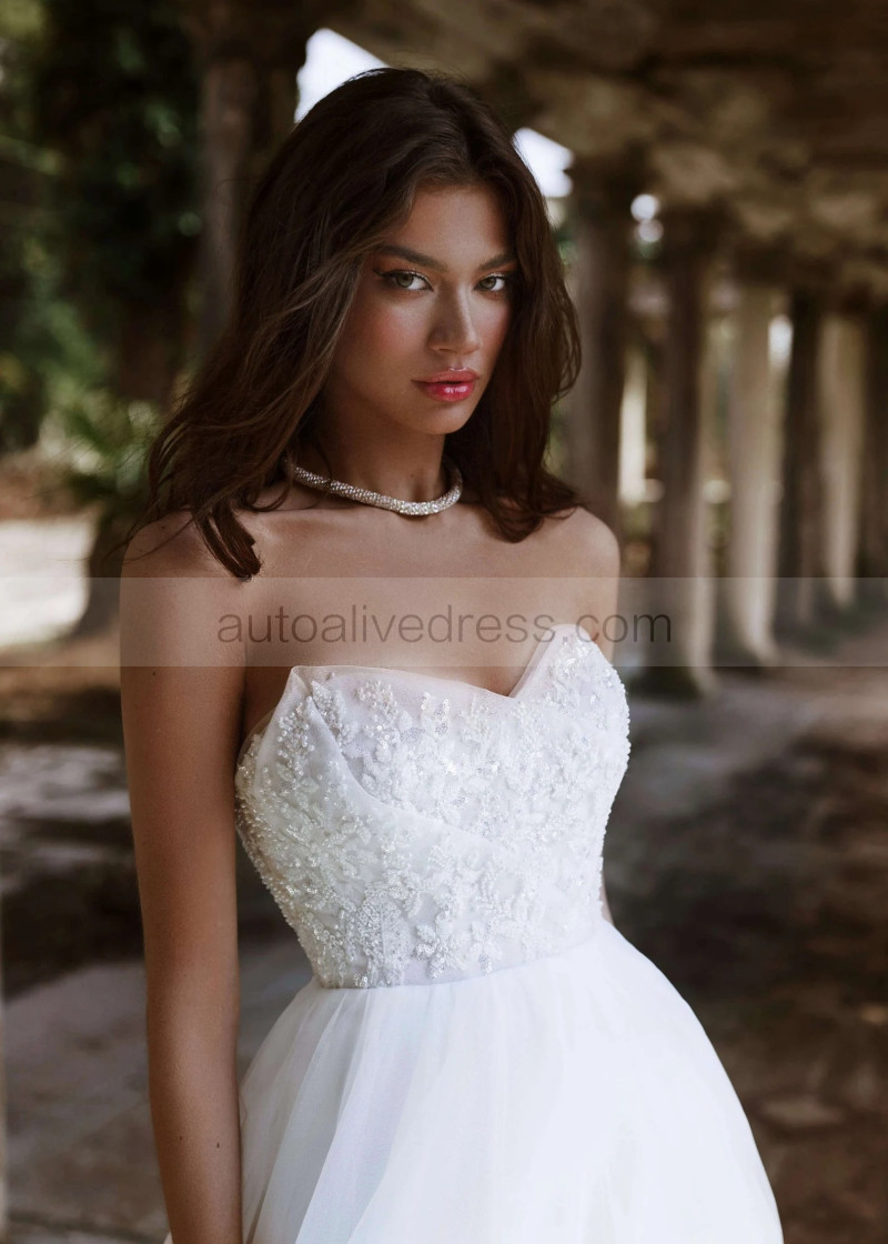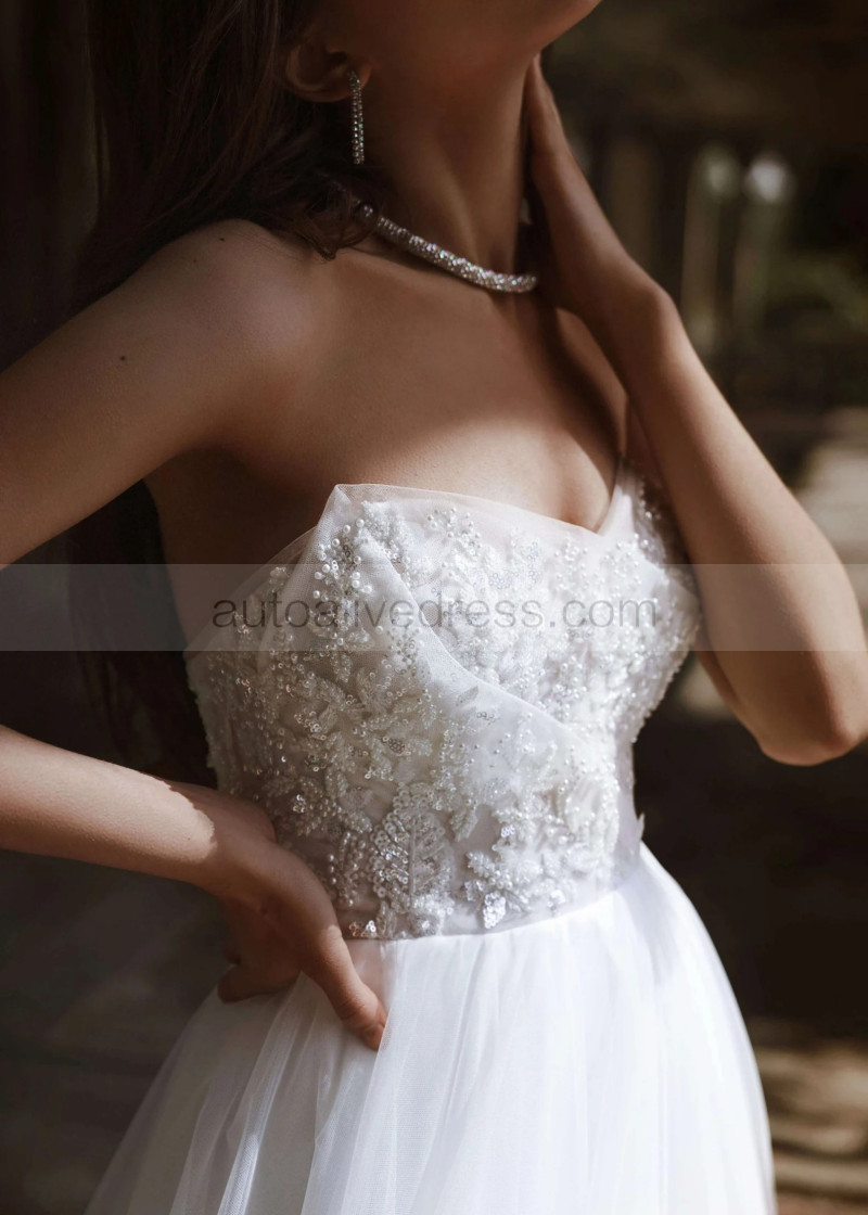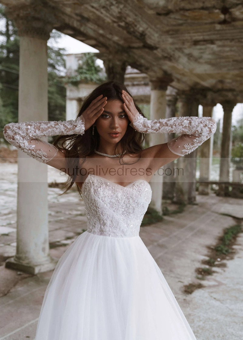 Strapless White Lace Tulle Twinkling Wedding Dress With Removable Sleeves