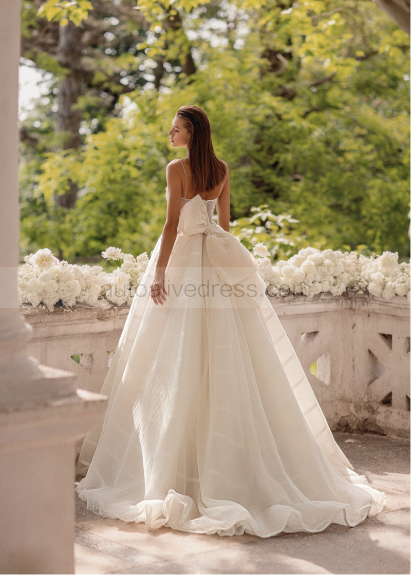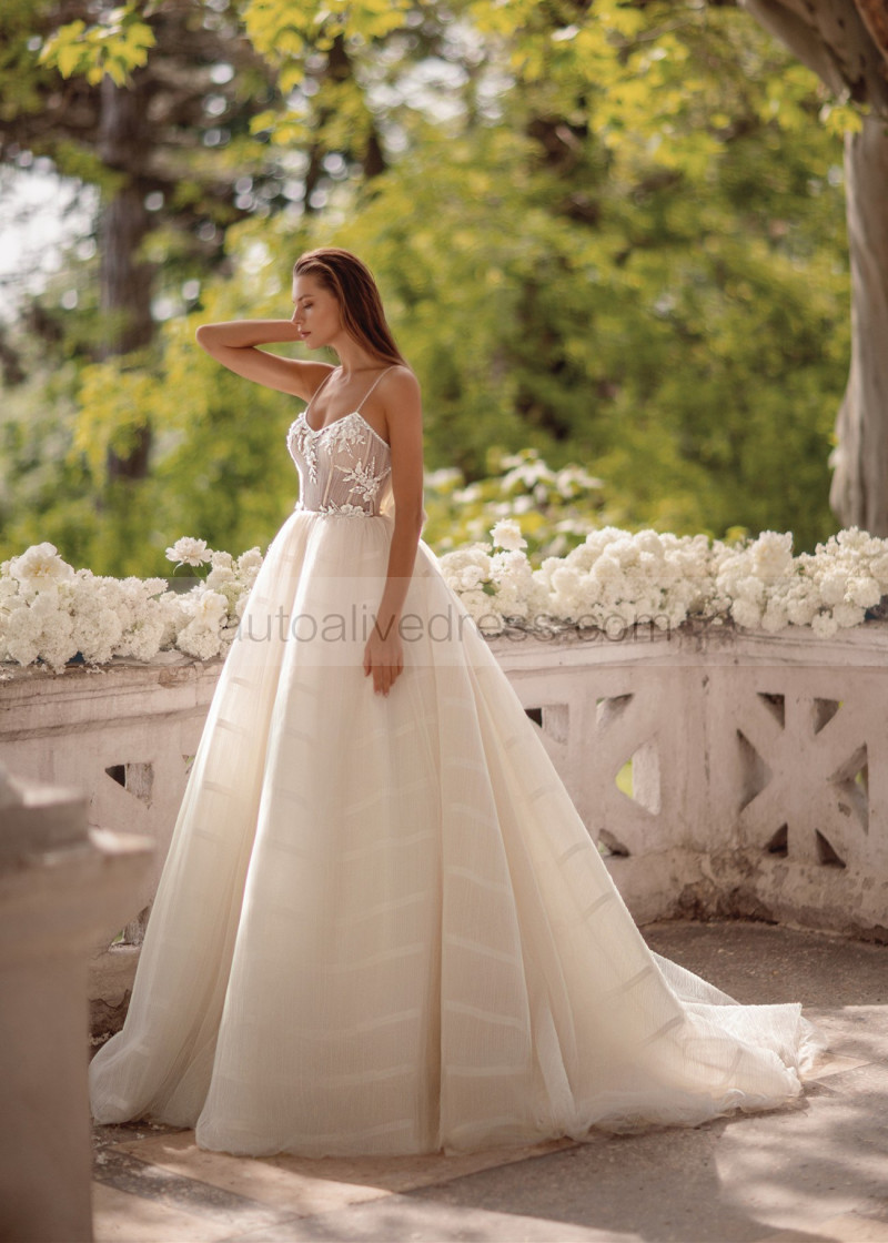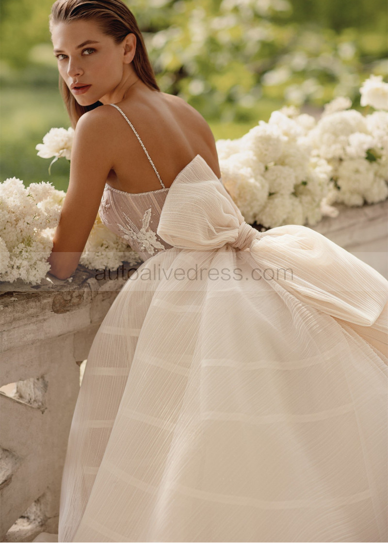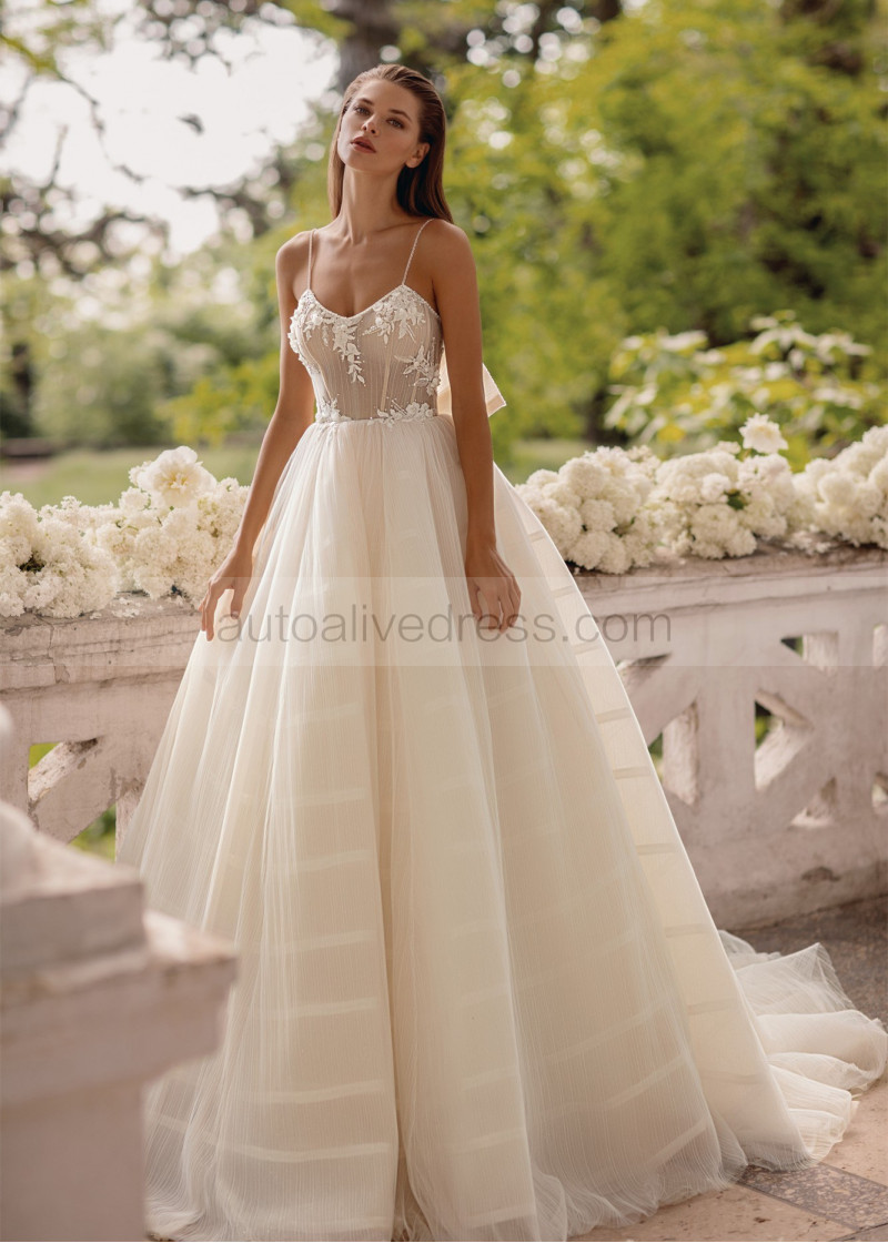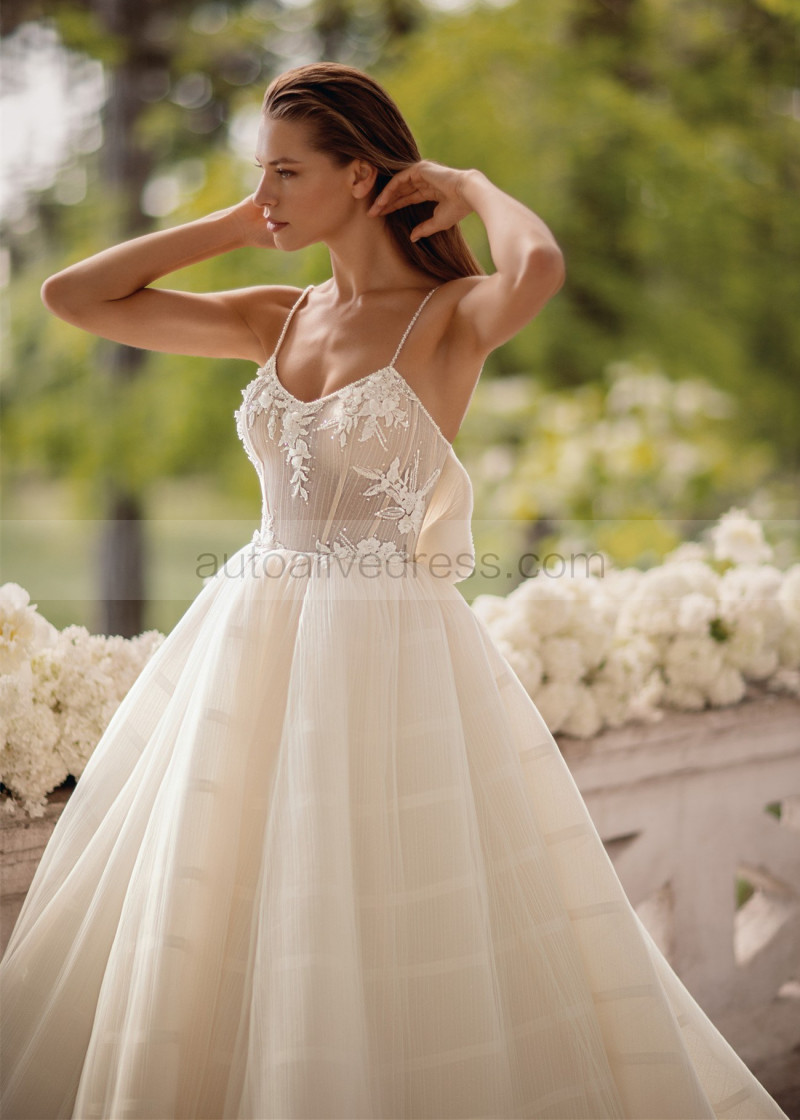Thin Straps Beaded Lace Pleated Tulle Wedding Dress