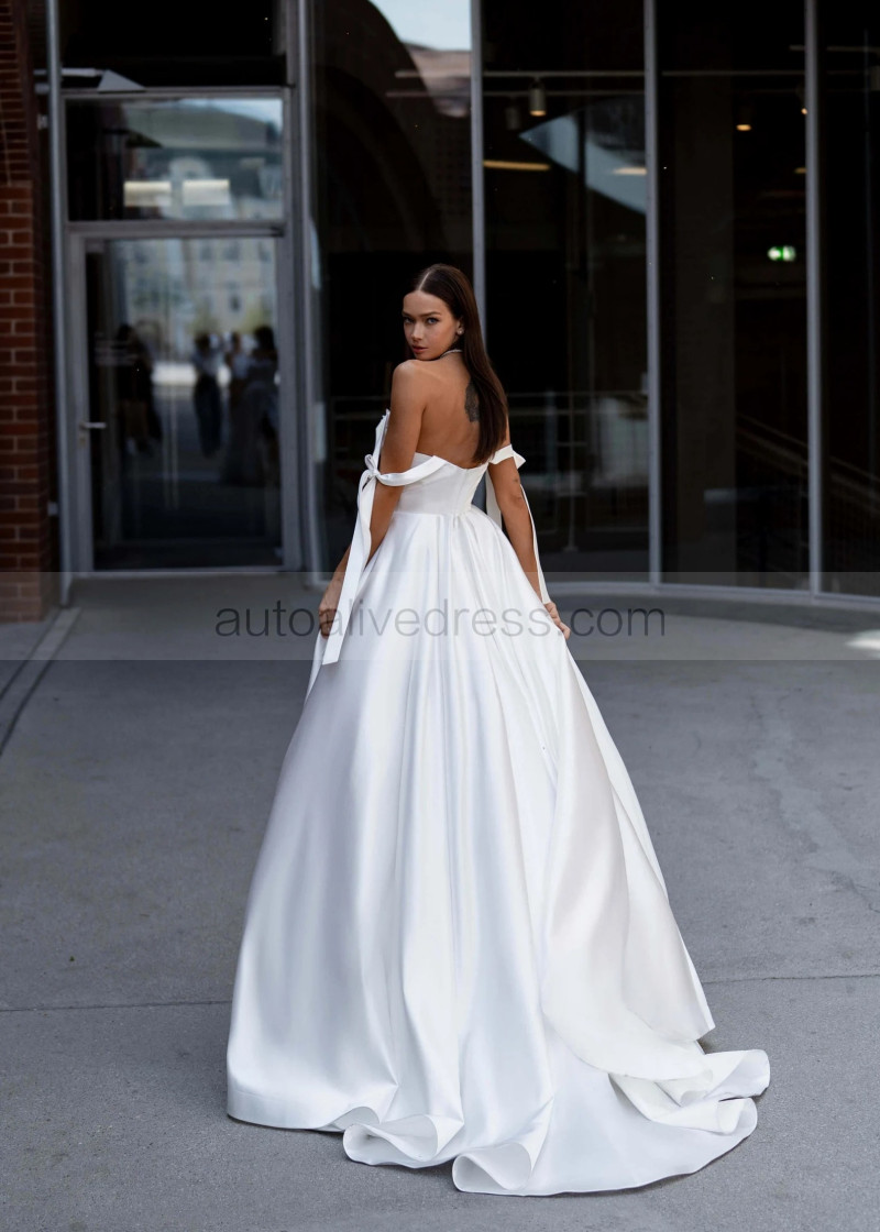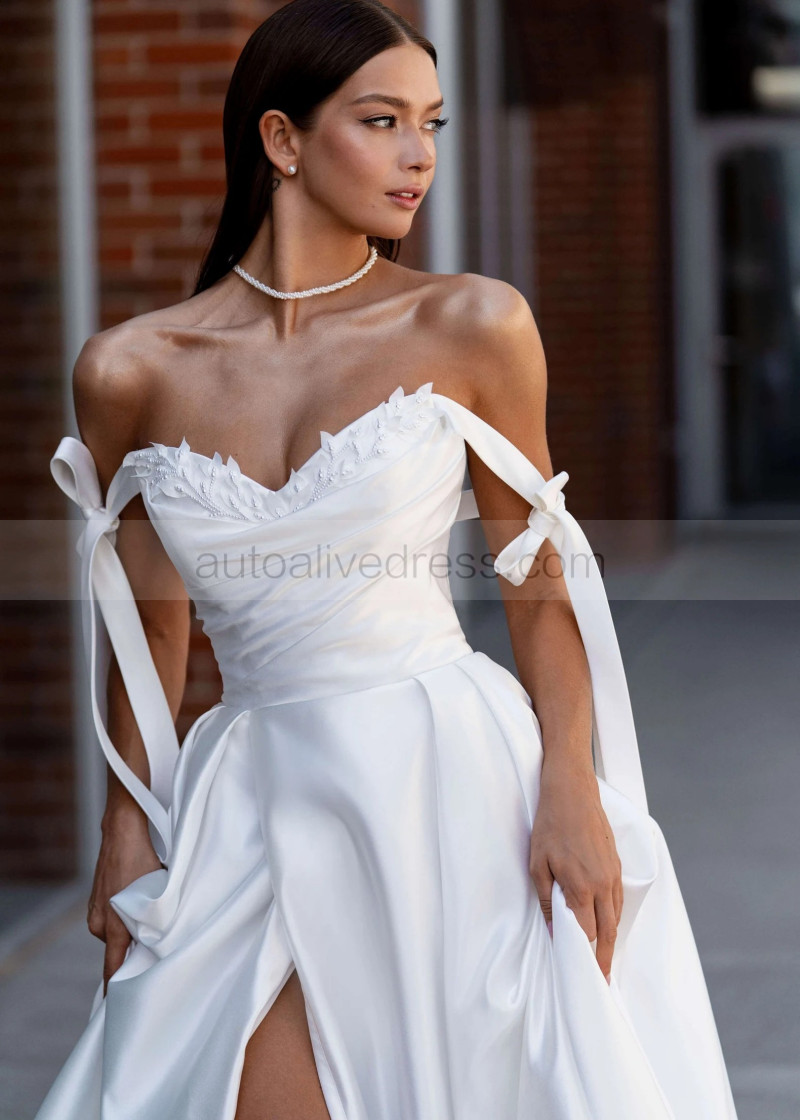Tie Straps Beaded White Satin Slit Elegant Wedding Dress