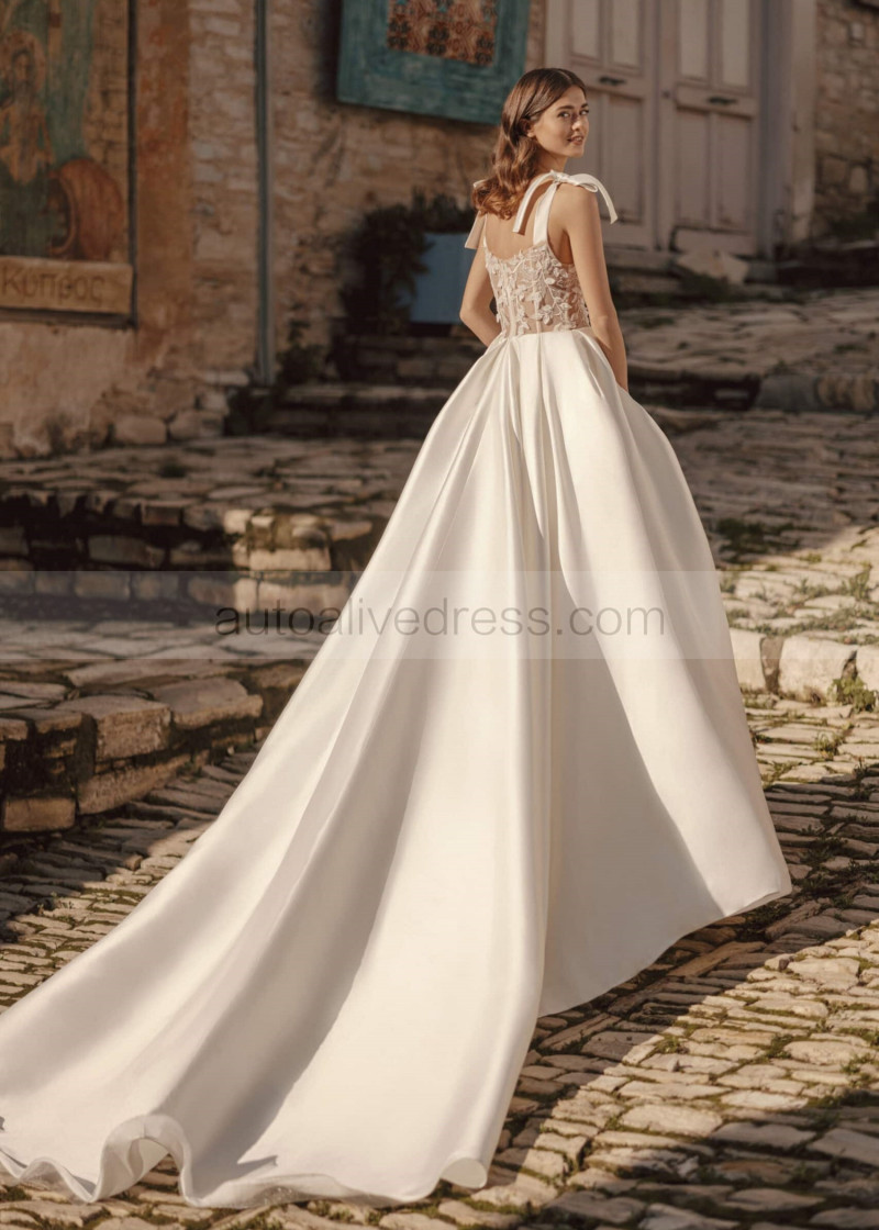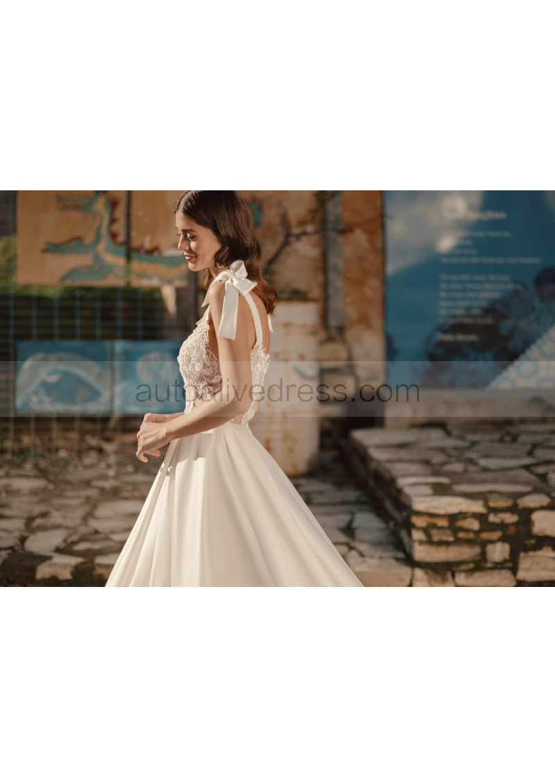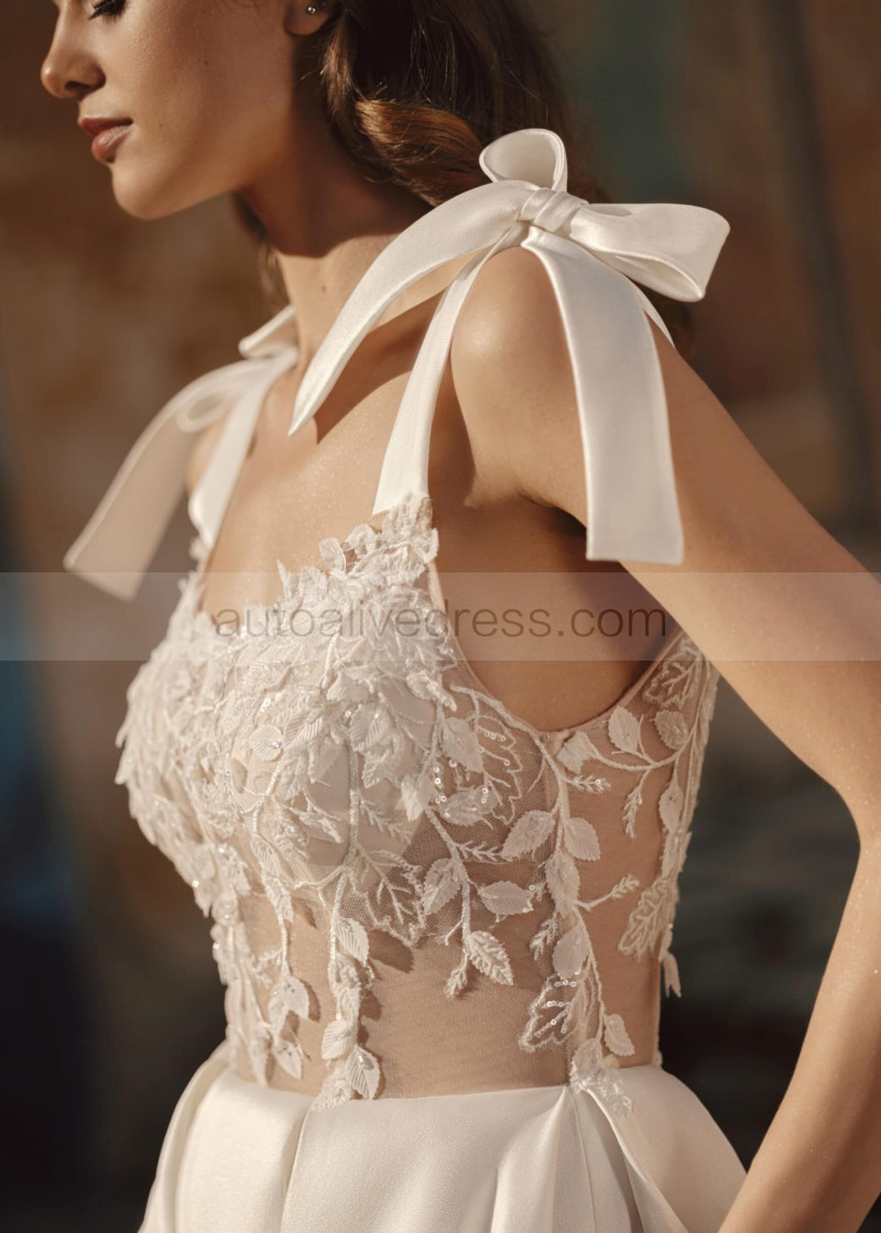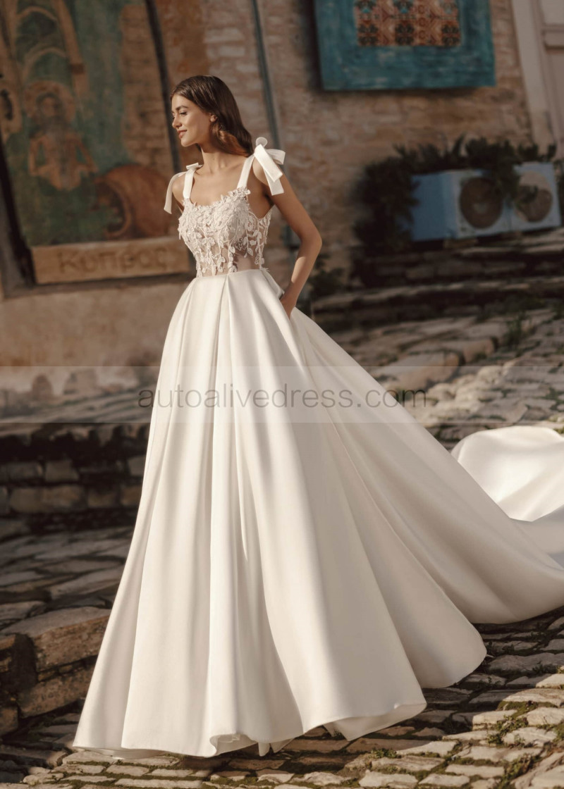 Tie Straps Ivory Lace Satin Pretty Wedding Dress