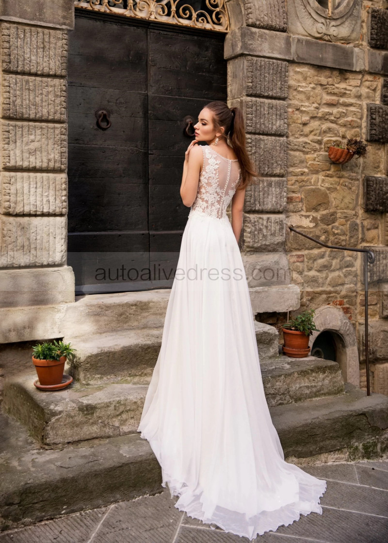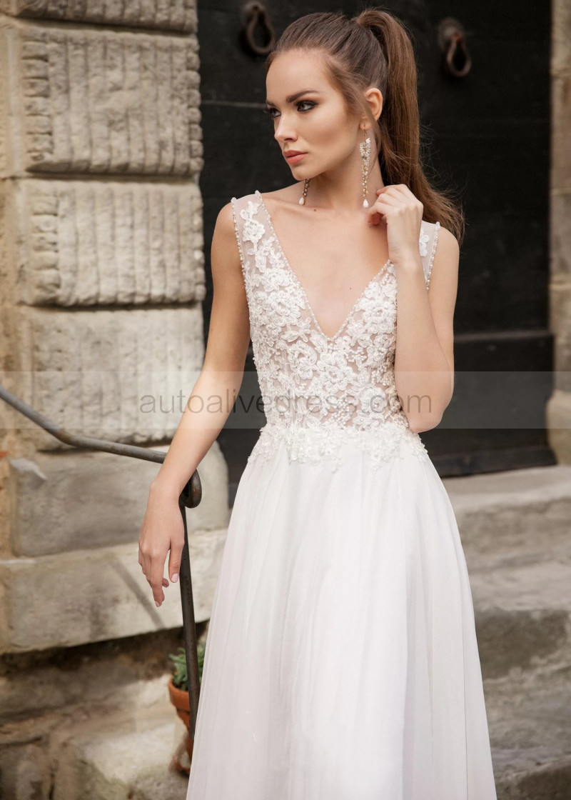 V Neck Beaded Ivory Lace Chiffon Airy Wedding Dress