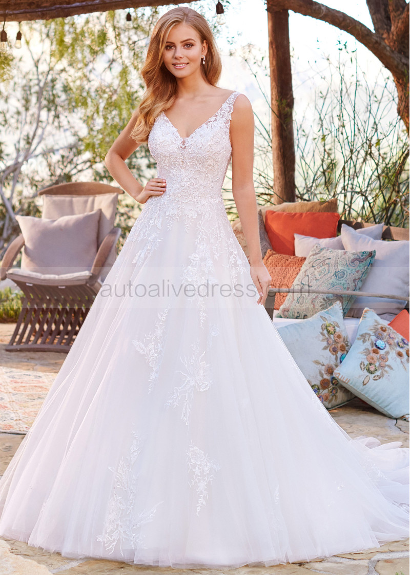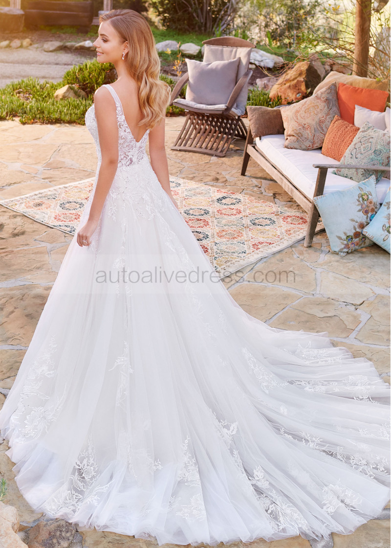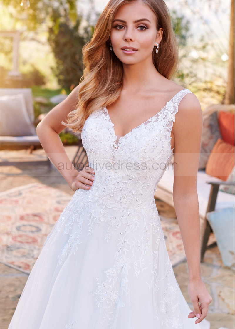 V Neck Beaded White Lace Tulle V Back Wedding Dress