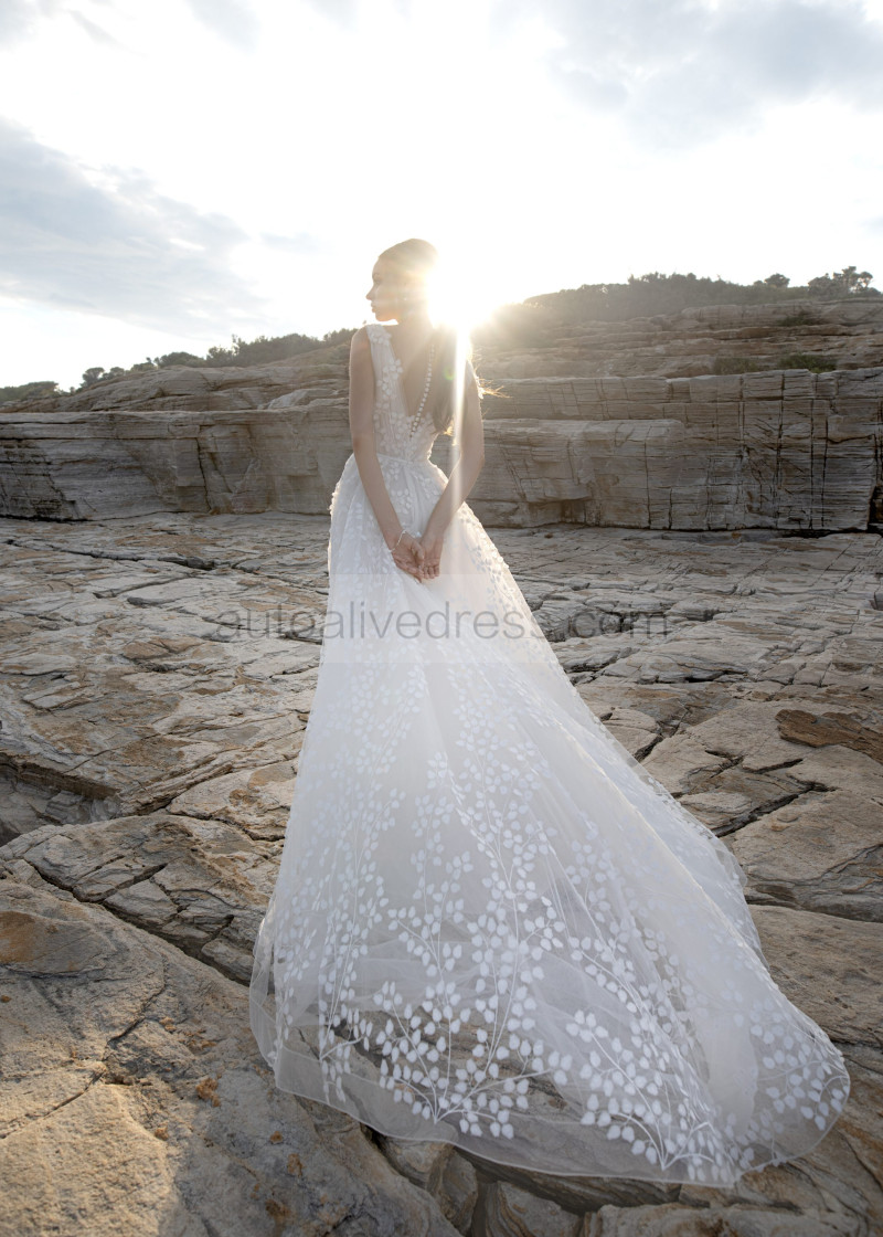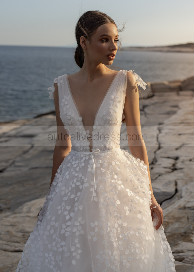 V Neck Ivory 3D Lace Tulle Floral Graceful Wedding Dress