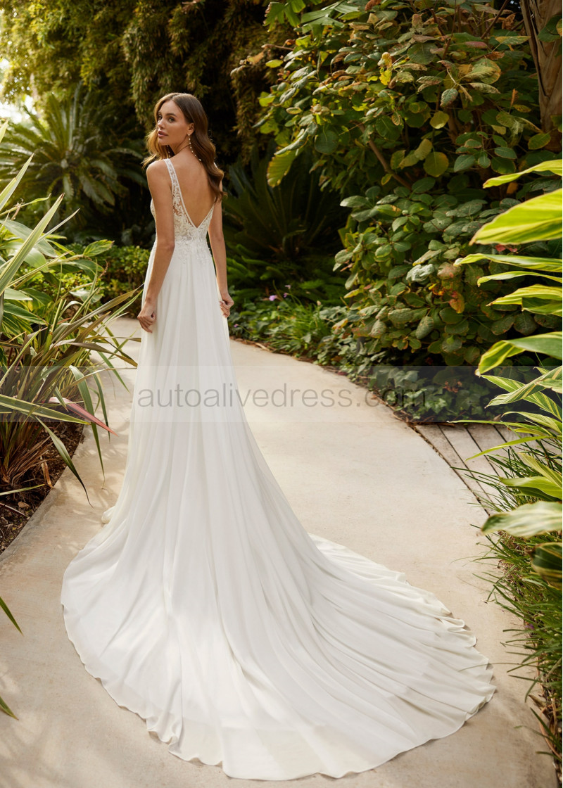 V Neck Beaded Ivory Lace Chiffon Airy Wedding Dress