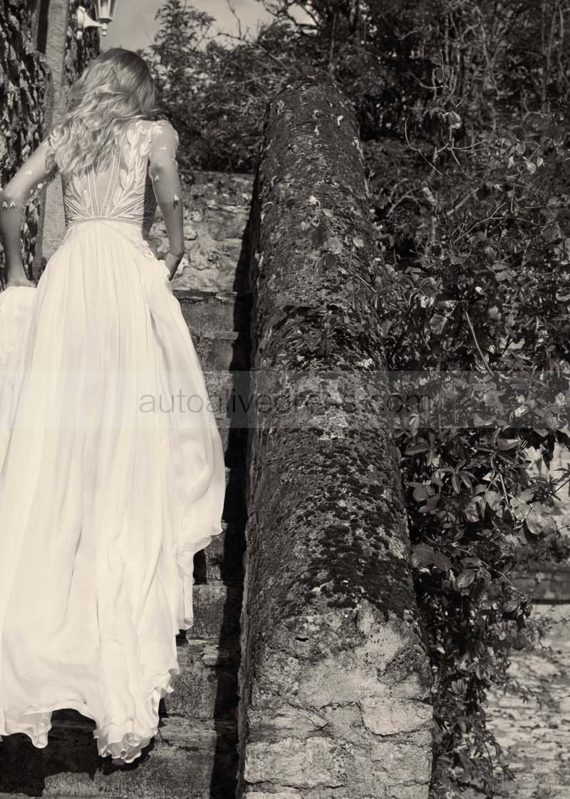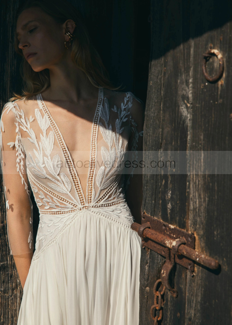 V Neck Ivory Lace Chiffon Flowing Wedding Dress