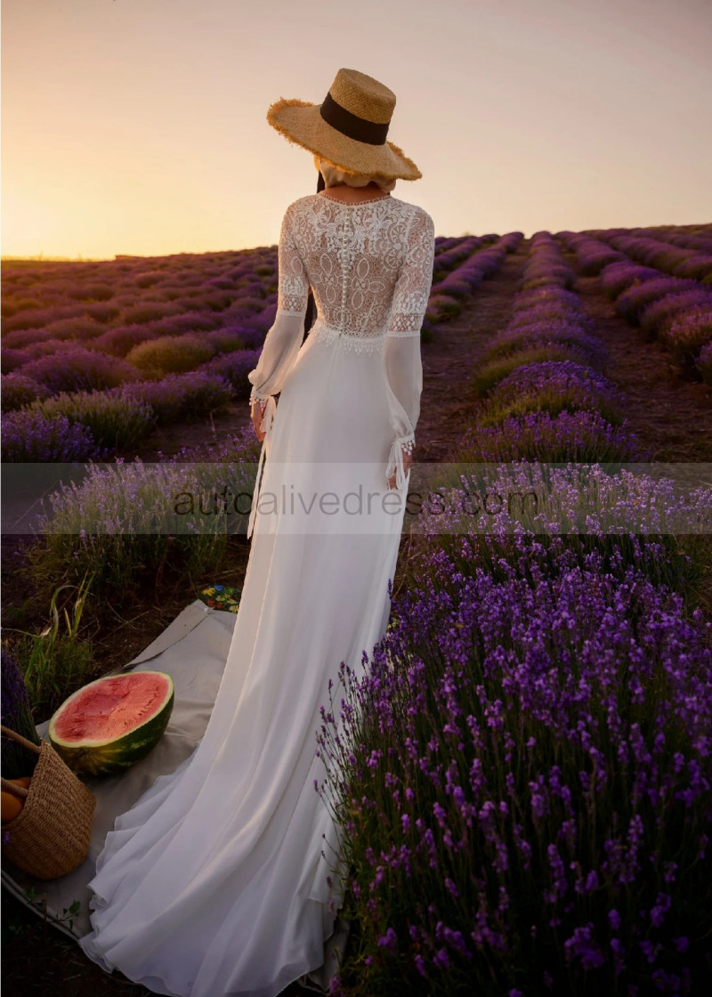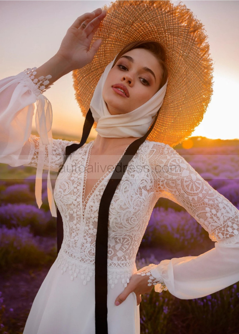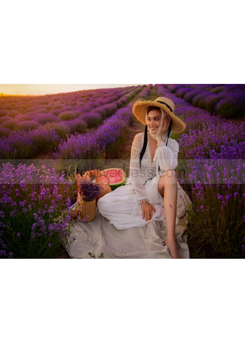 V Neck Ivory Lace Chiffon Garden Wedding Dress