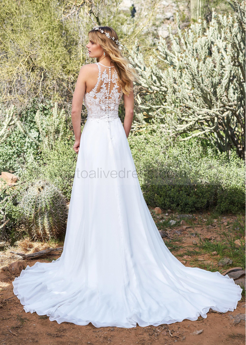 V Neck Ivory Lace Chiffon High Slit Wedding Dress