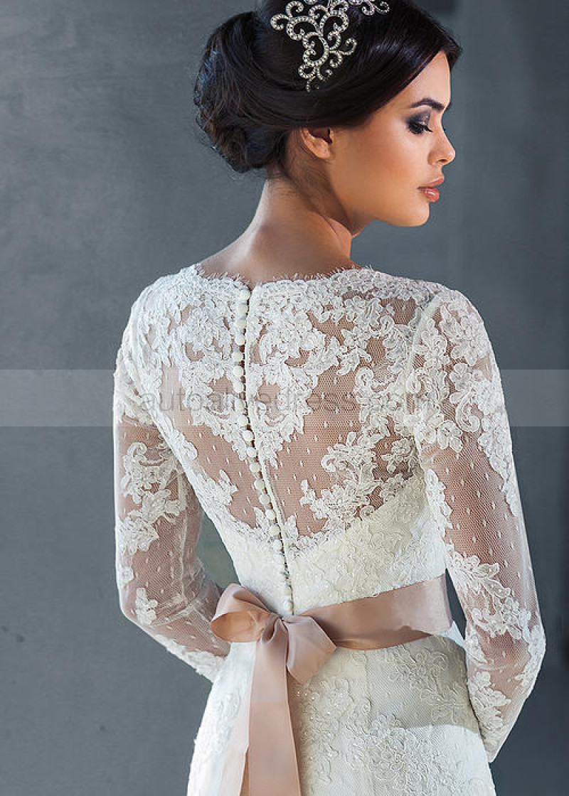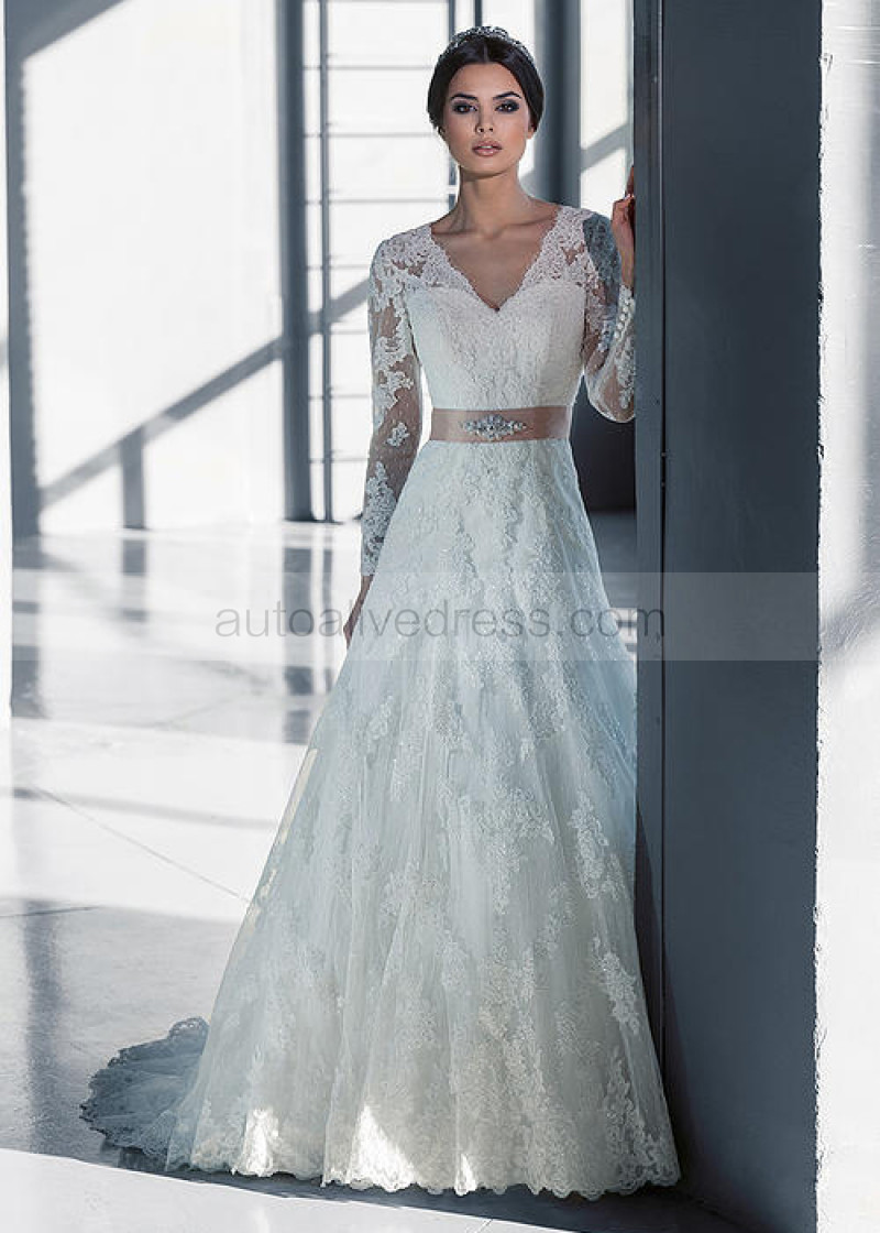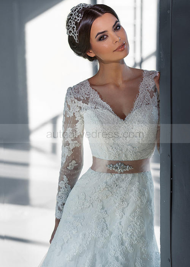 V Neck Ivory Lace Polka Dots Tulle Long Sleeves Wedding Dress