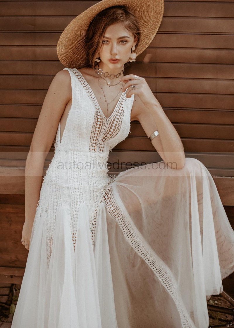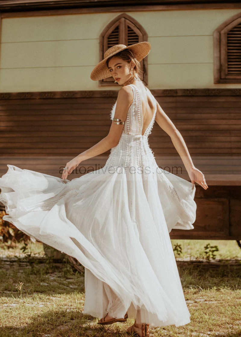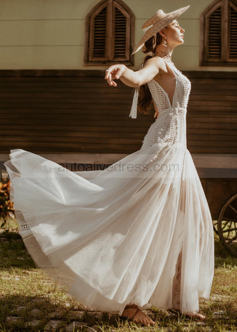 V Neck Ivory Lace Tulle Boho Hippie Wedding Dress