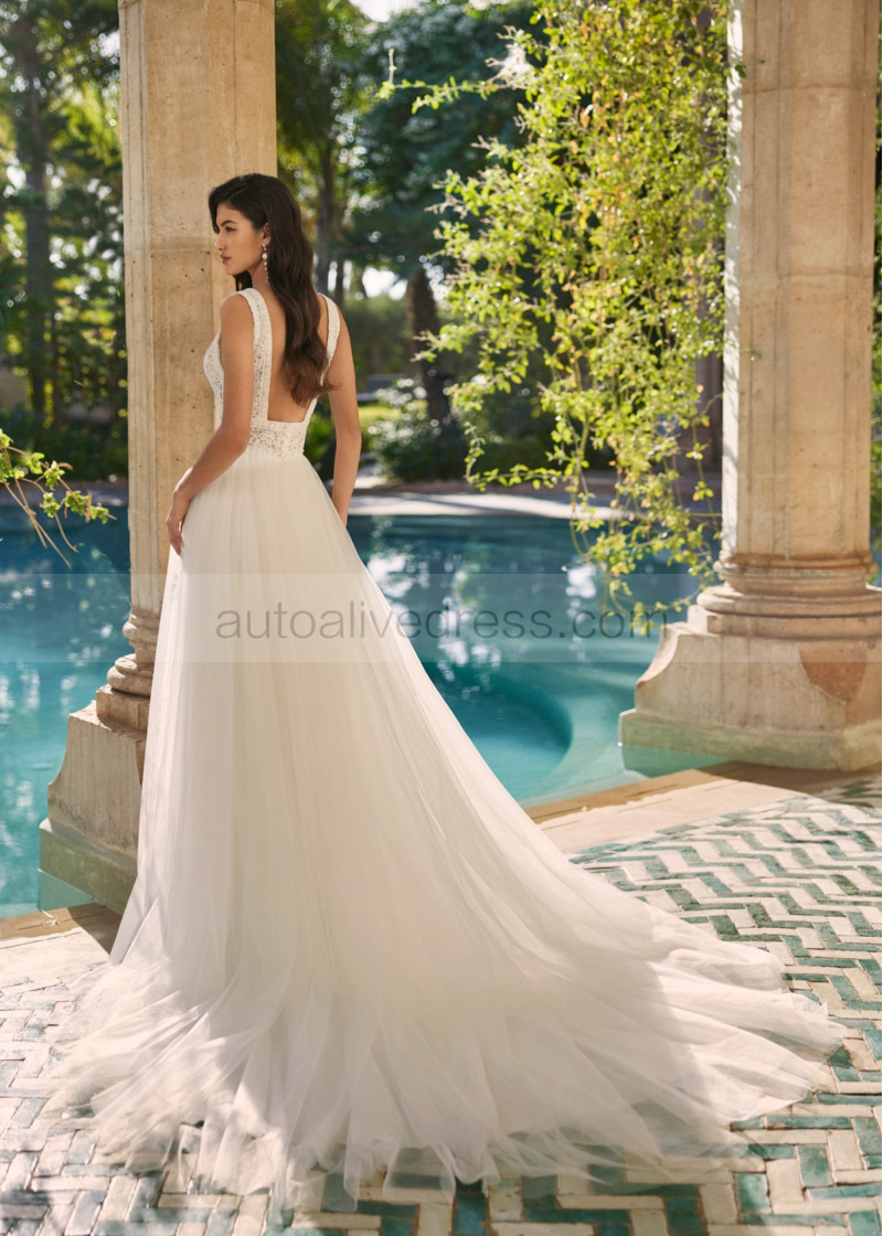 V Neck Ivory Lace Tulle Square Back Unusual Wedding Dress