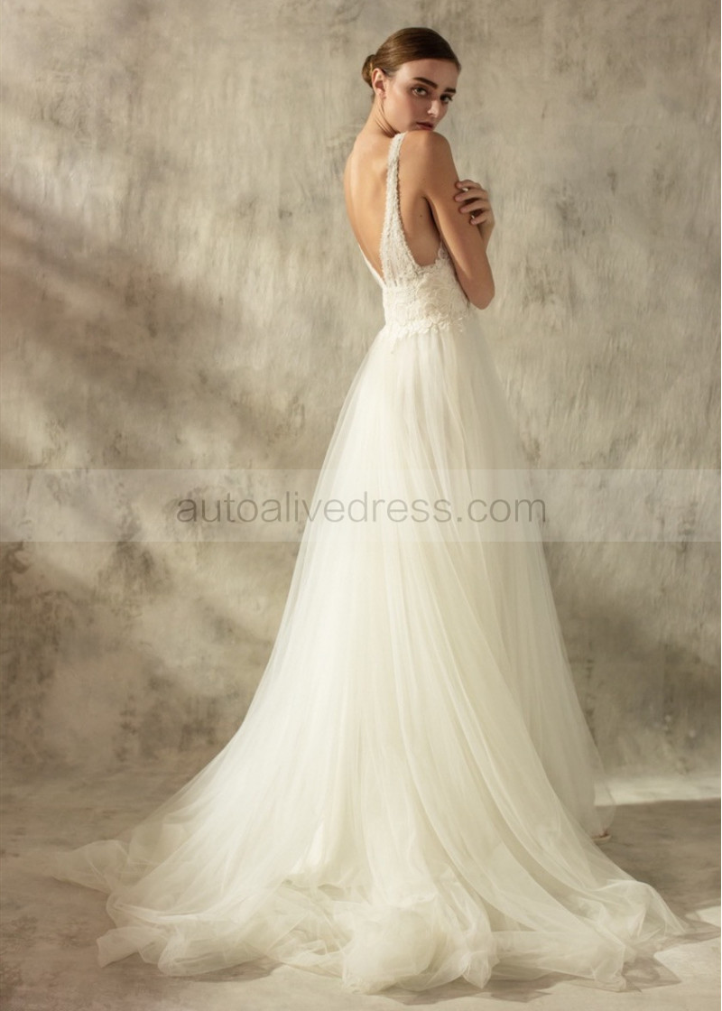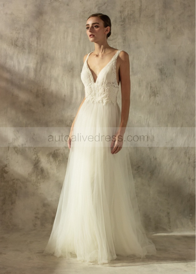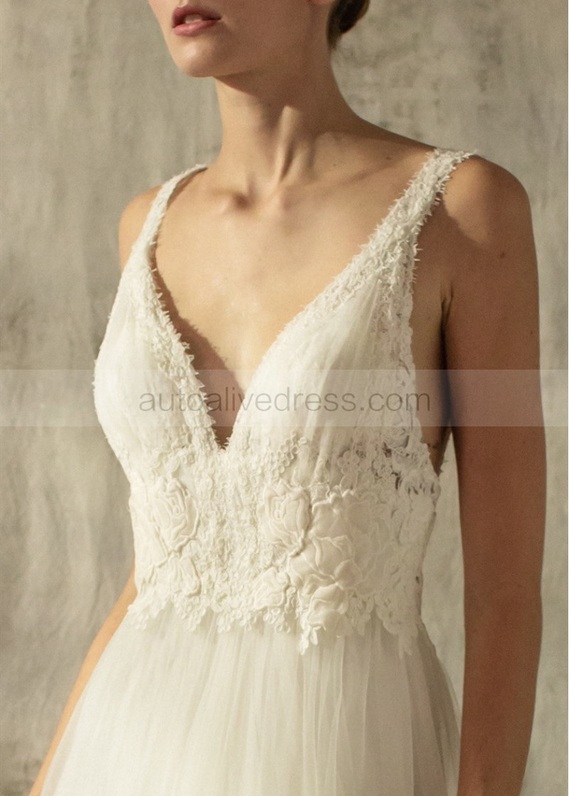 V Neck Ivory Lace Tulle Velvet Flowers Wedding Dress
