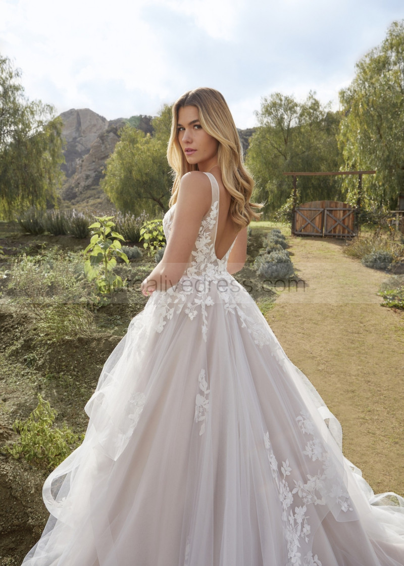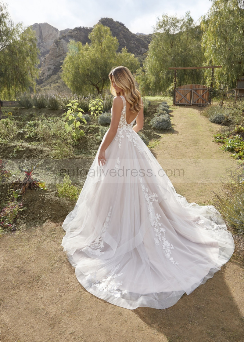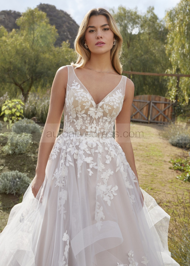 V Neck Ivory Lace Tulle Wedding Dress With Horsehair Trim