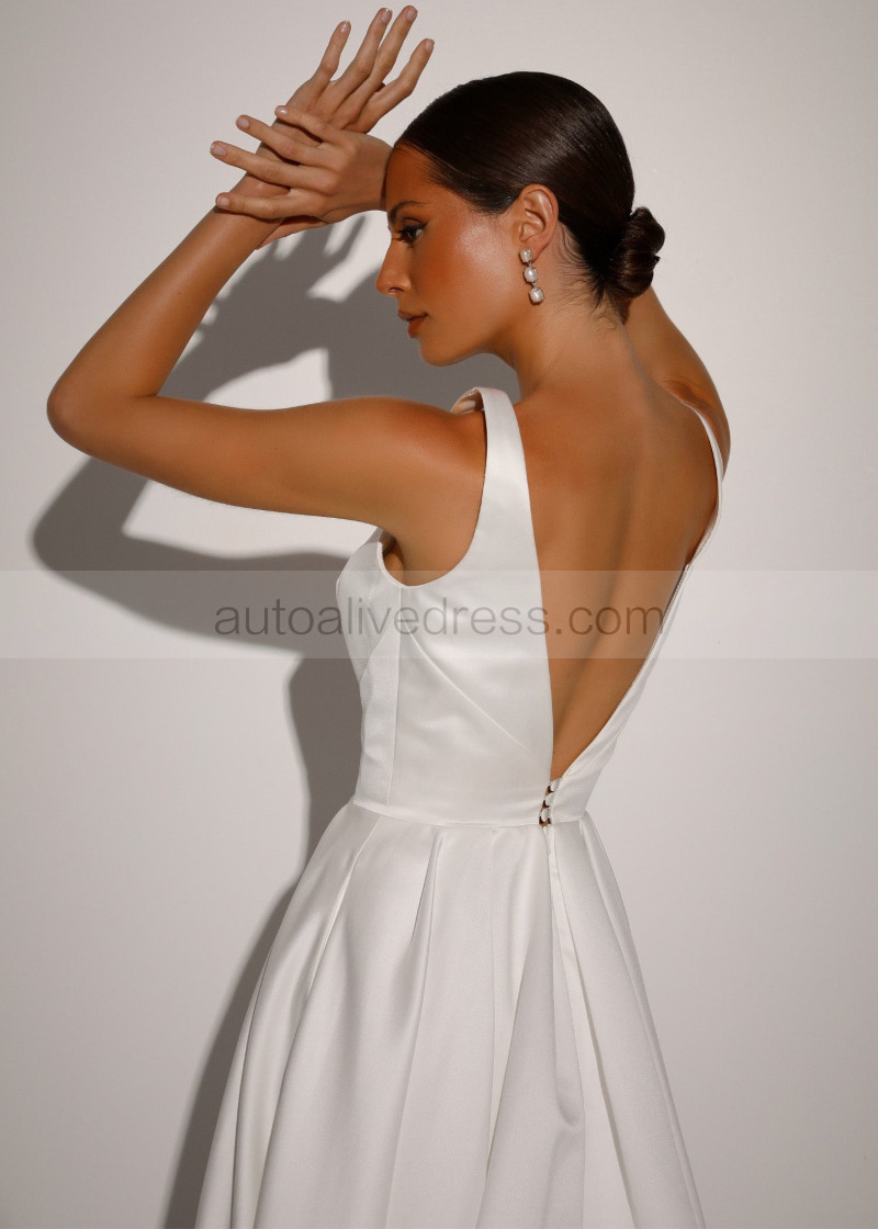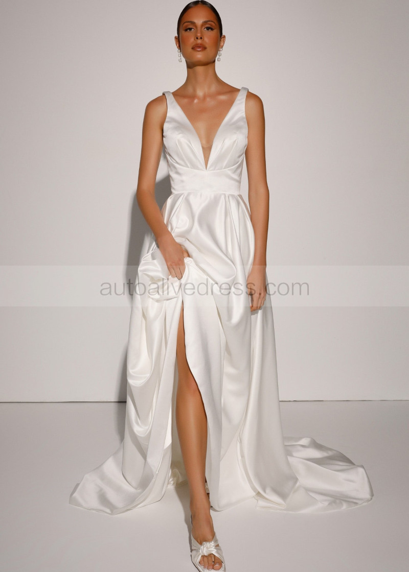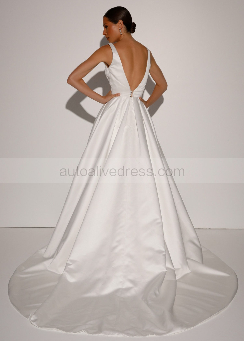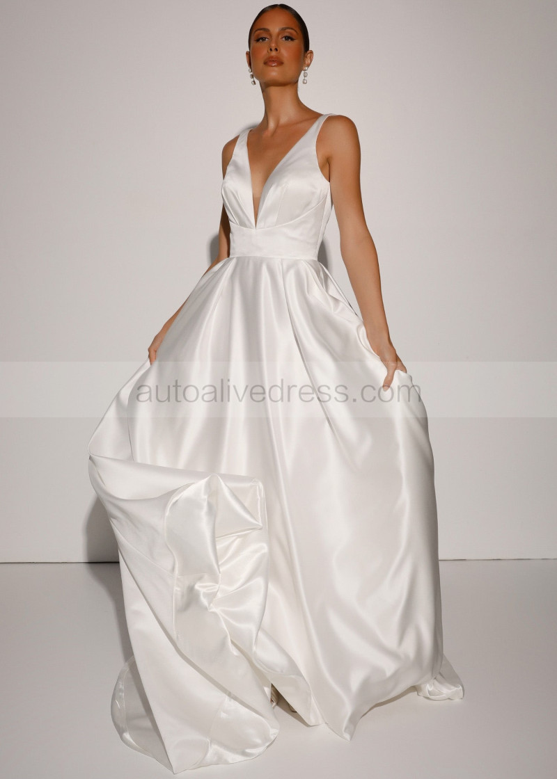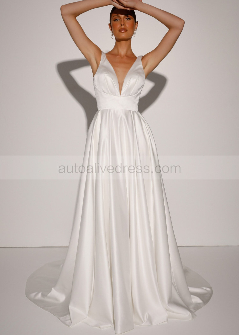 V Neck Ivory Satin Elegant Wedding Dress