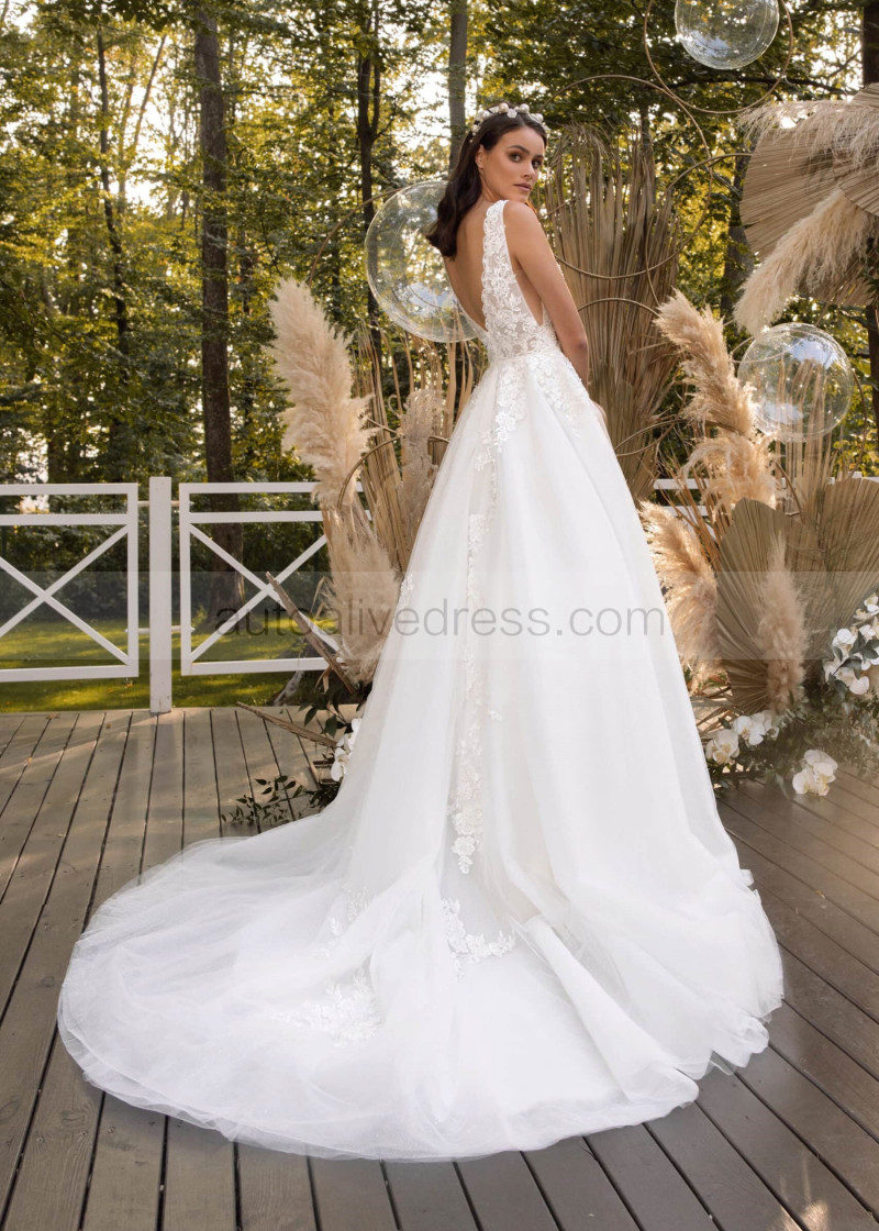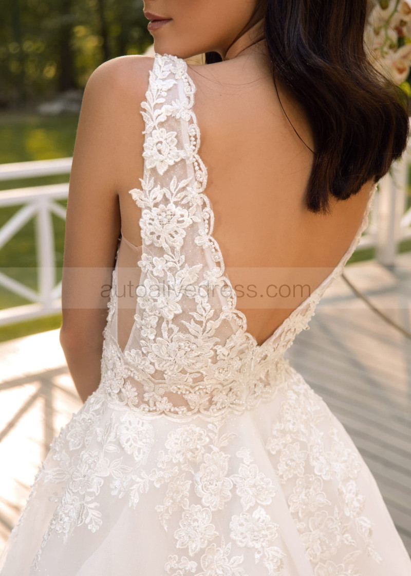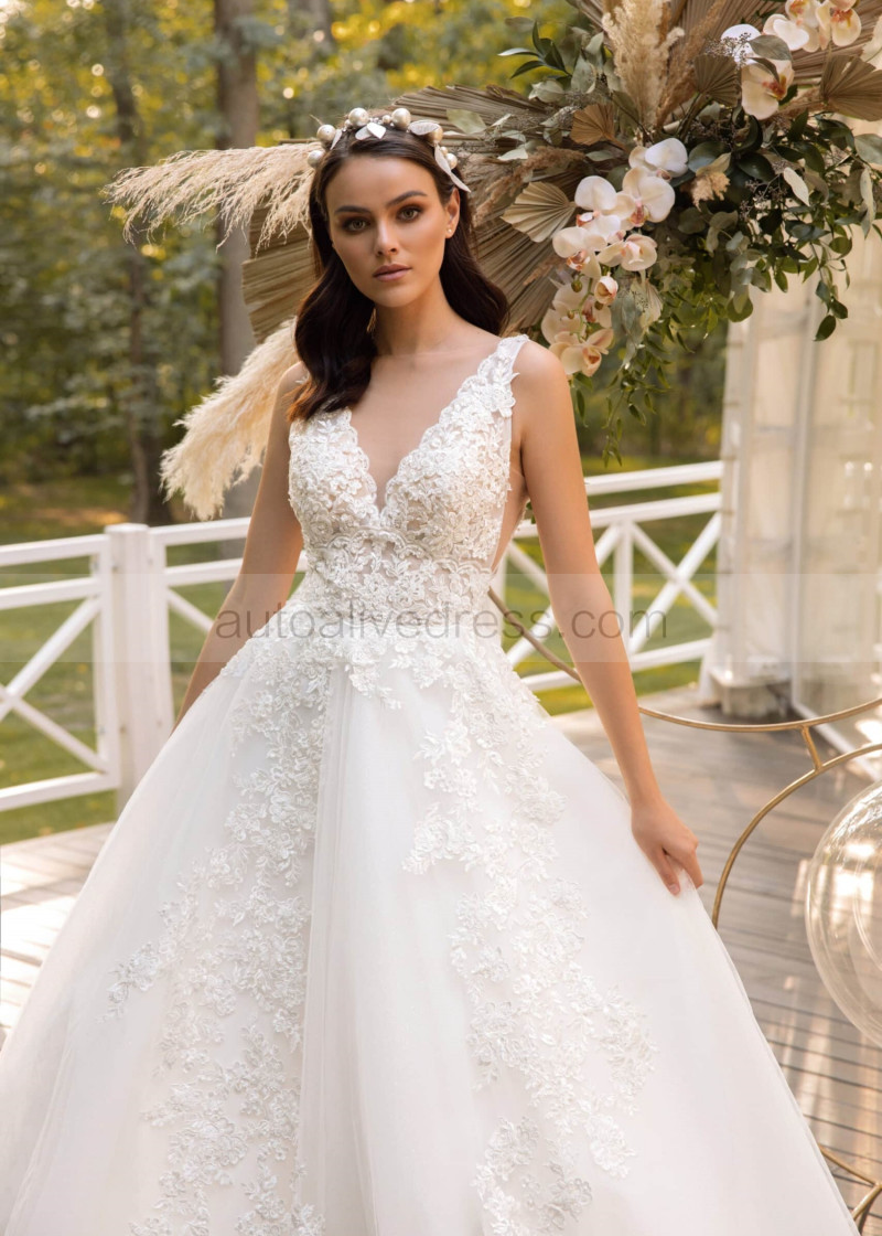 V Neck Pearls Beaded Ivory Lace Tulle Sparkly Wedding Dress