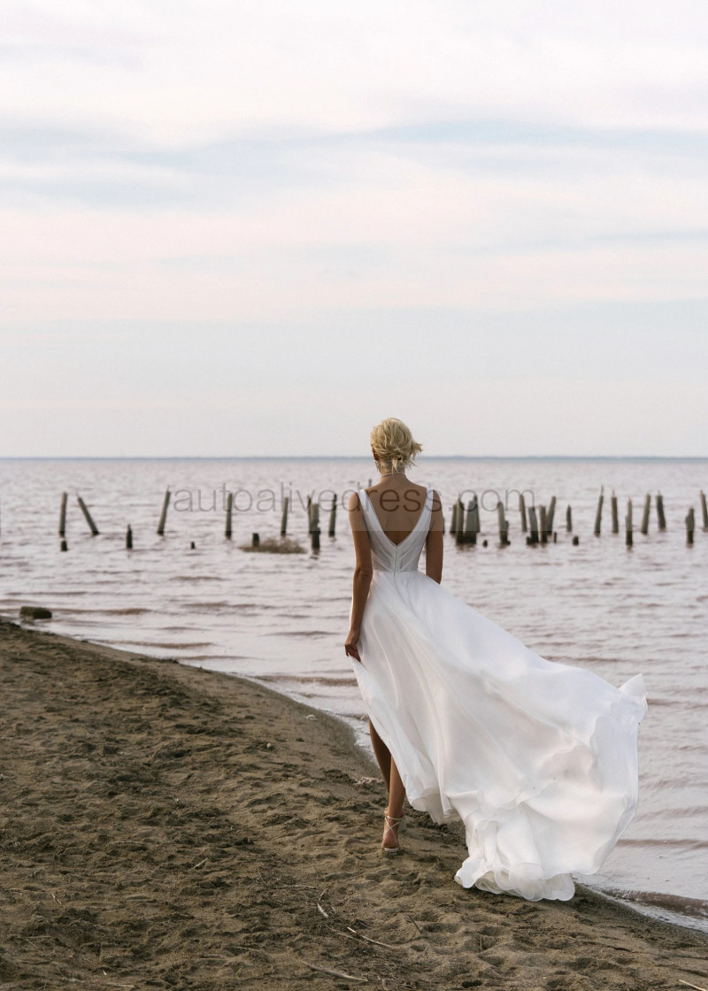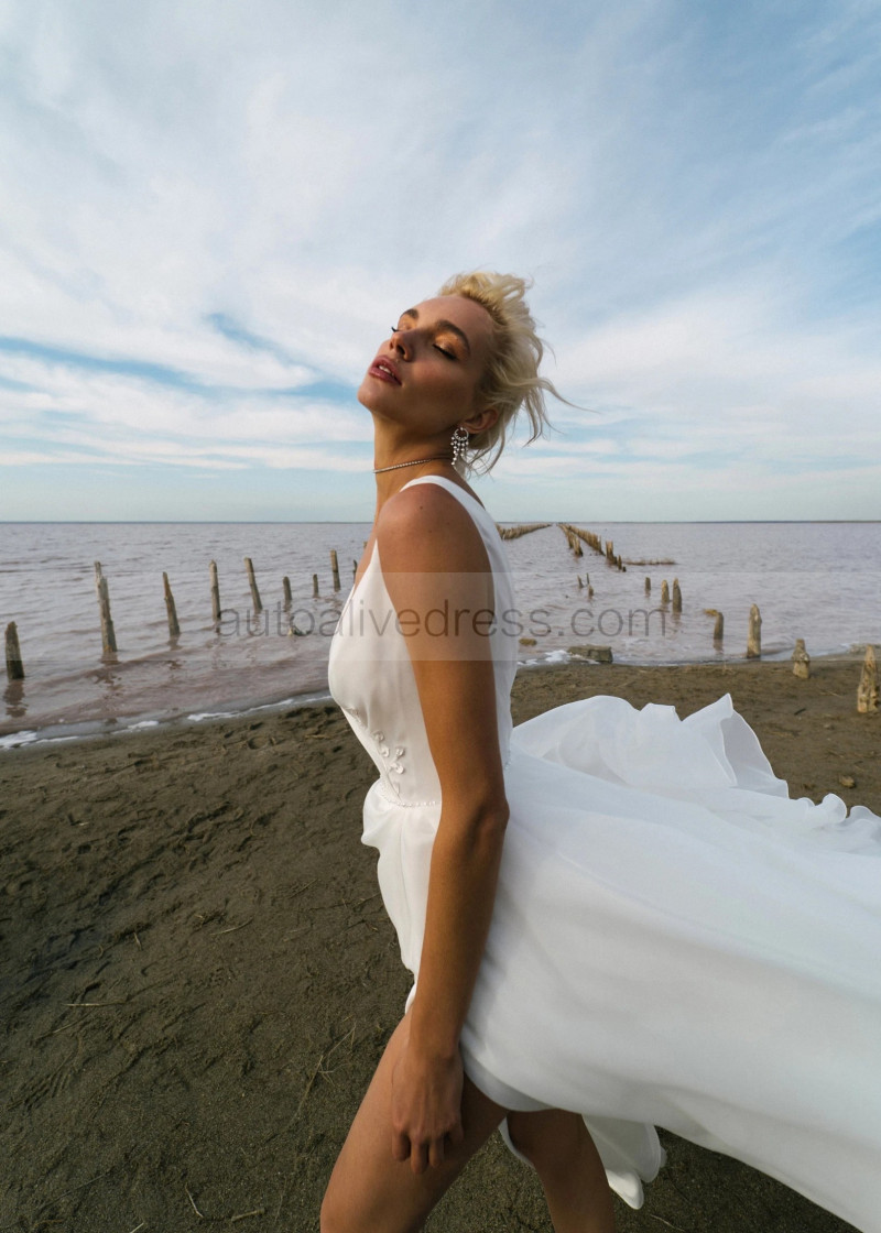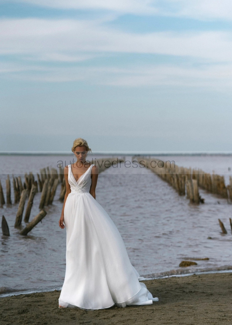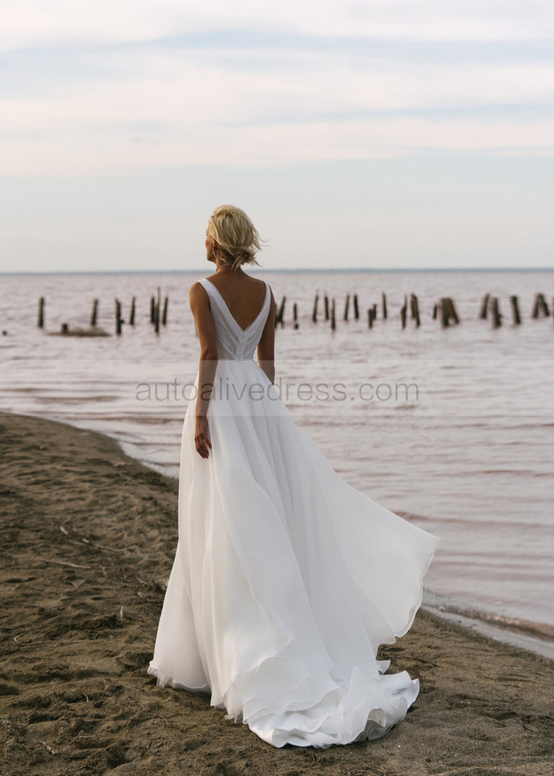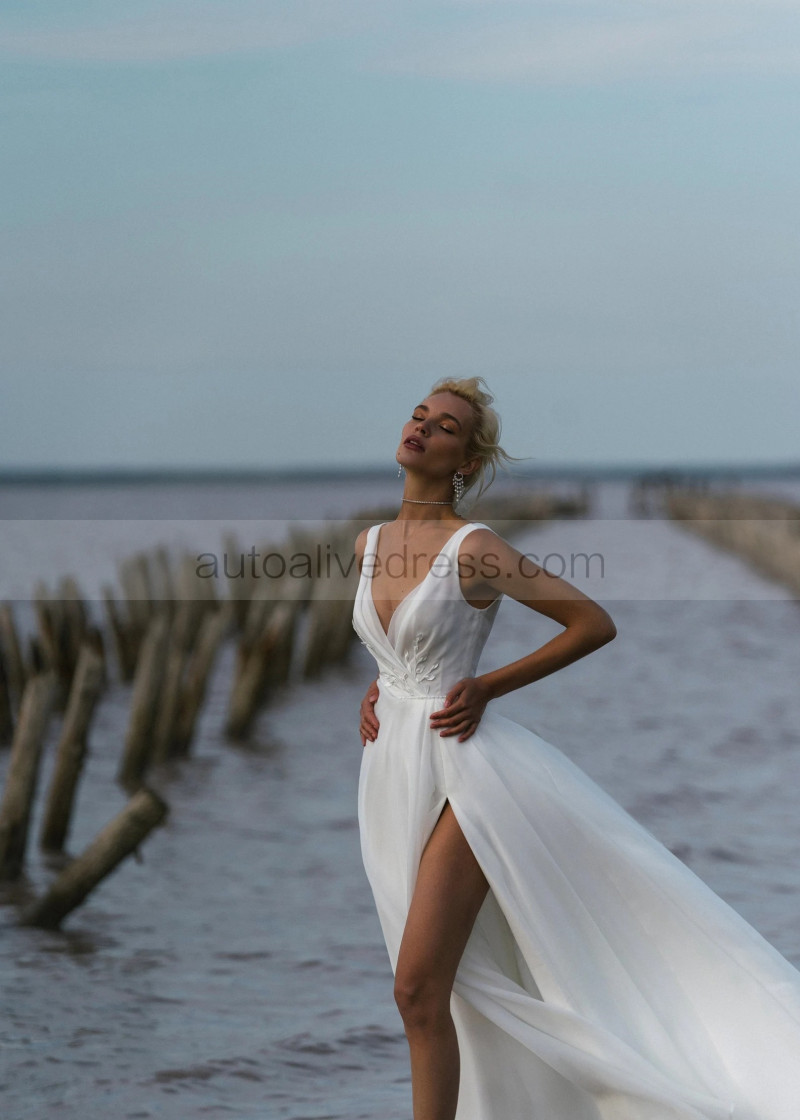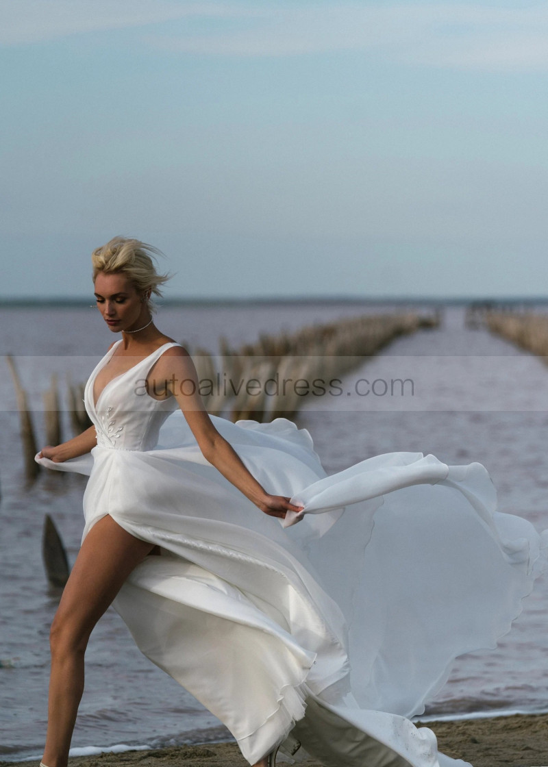 V Neck White Organza Slit Sexy Beach Wedding Dress