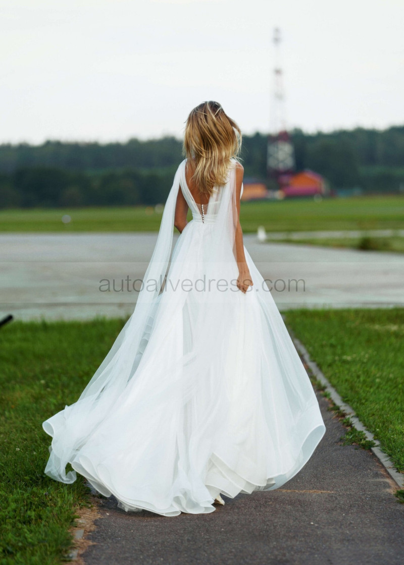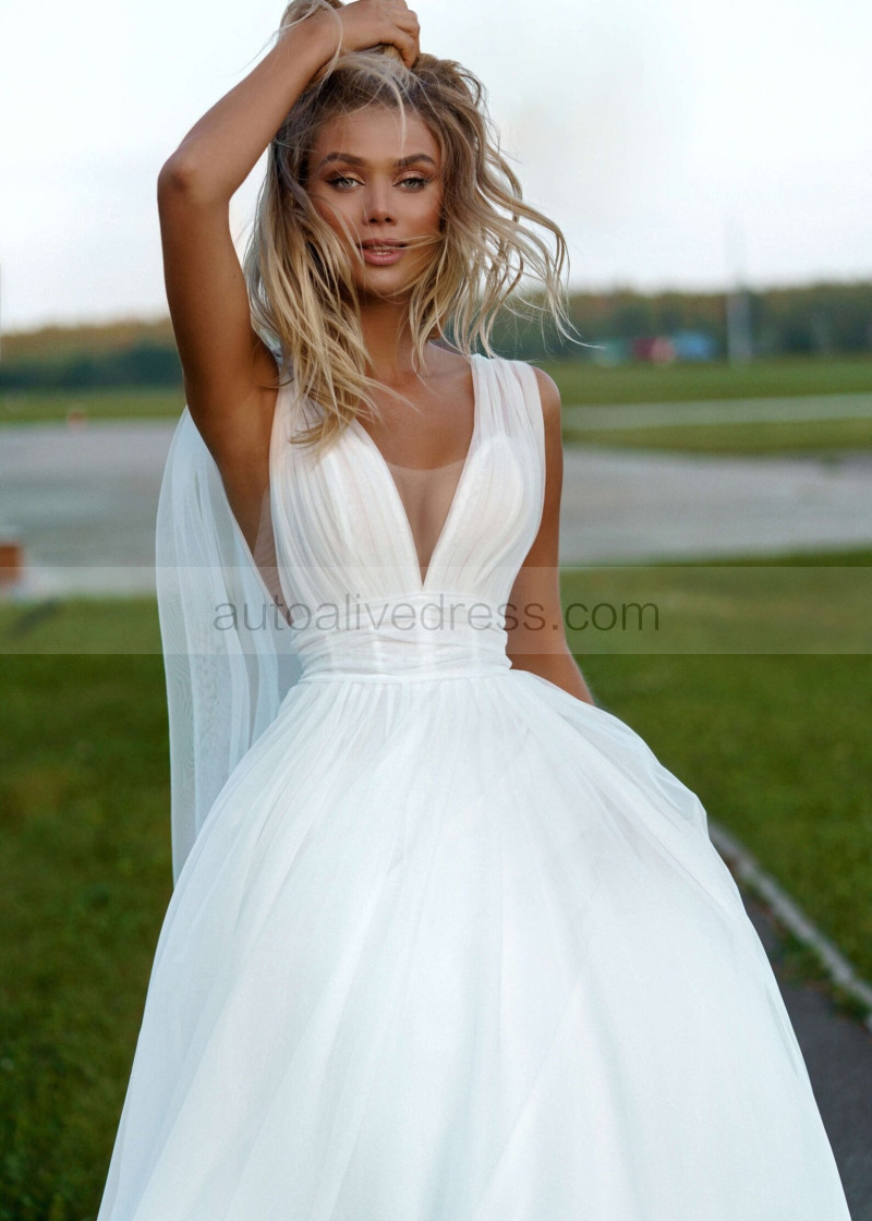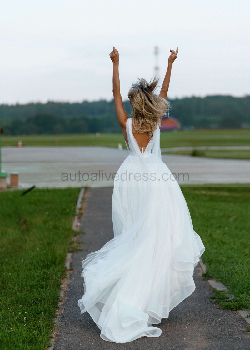 V Neck White Tulle Open Back Flowing Wedding Dress