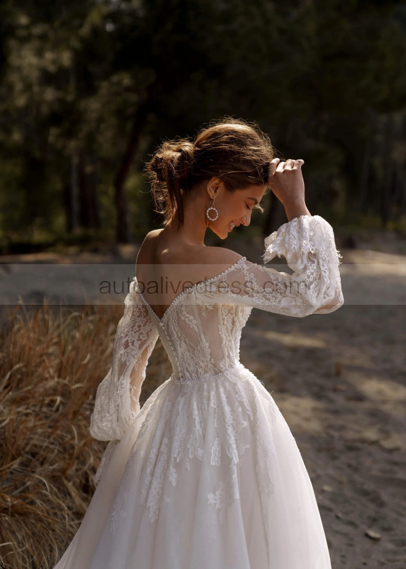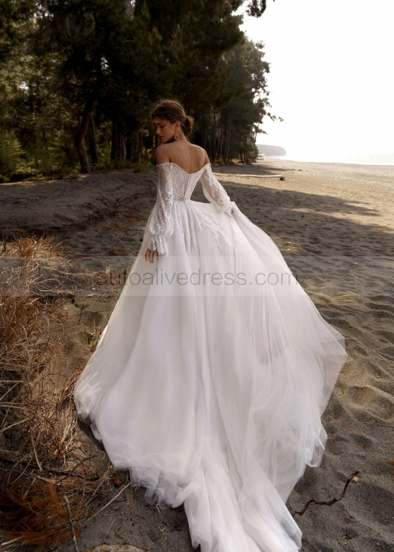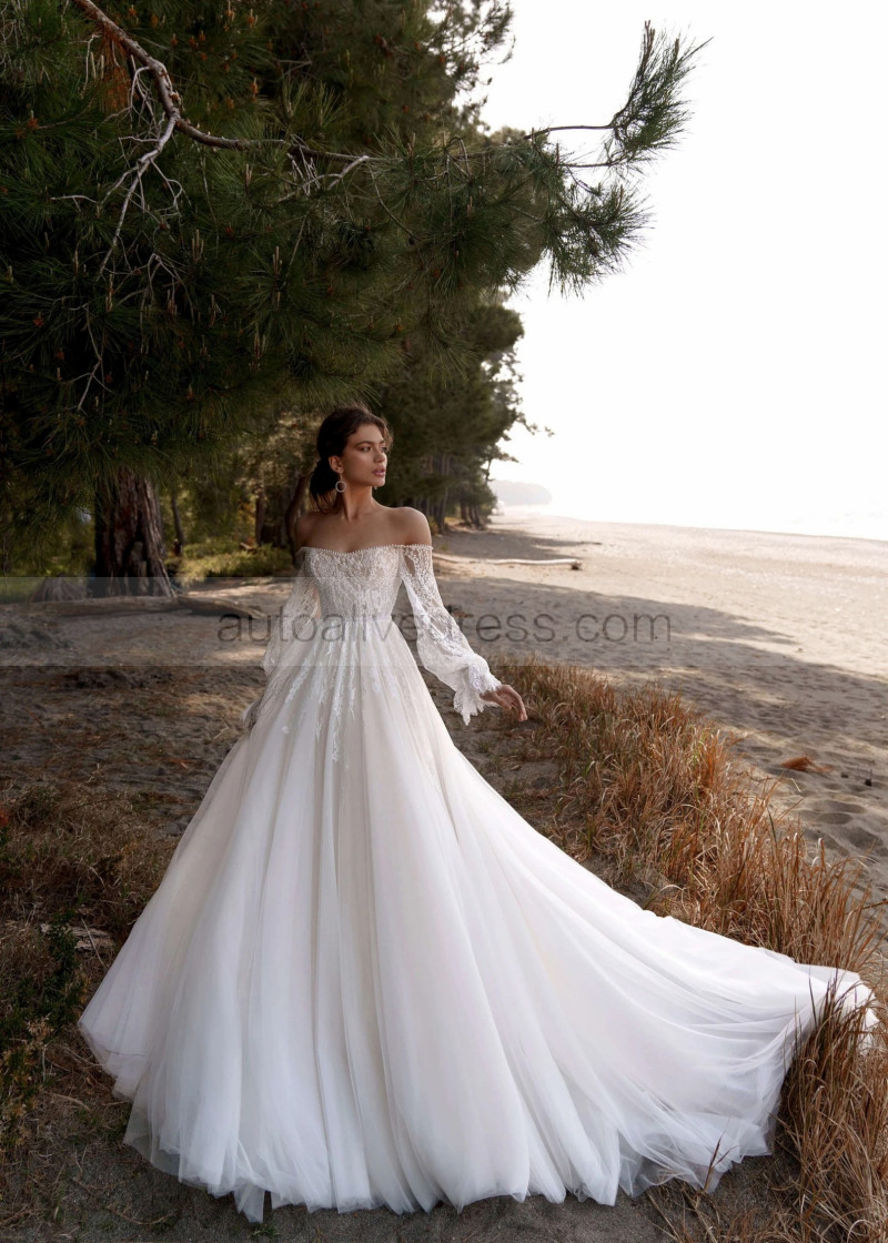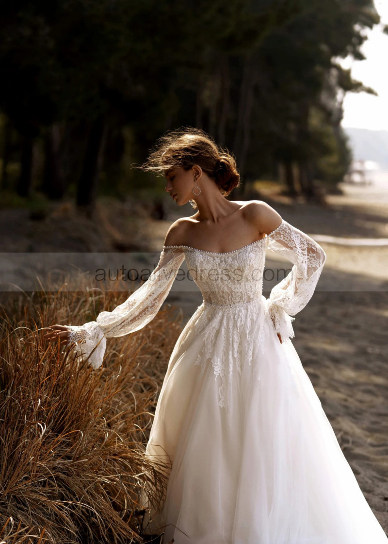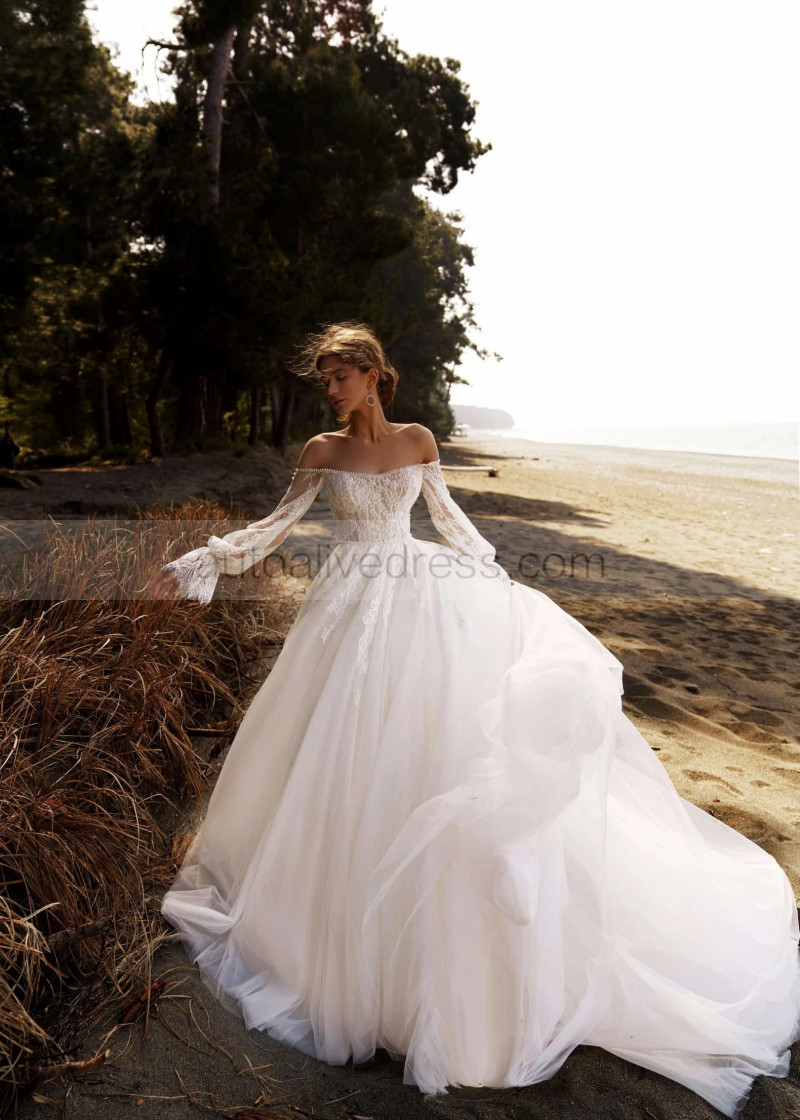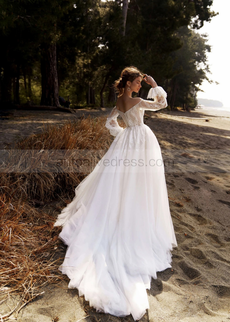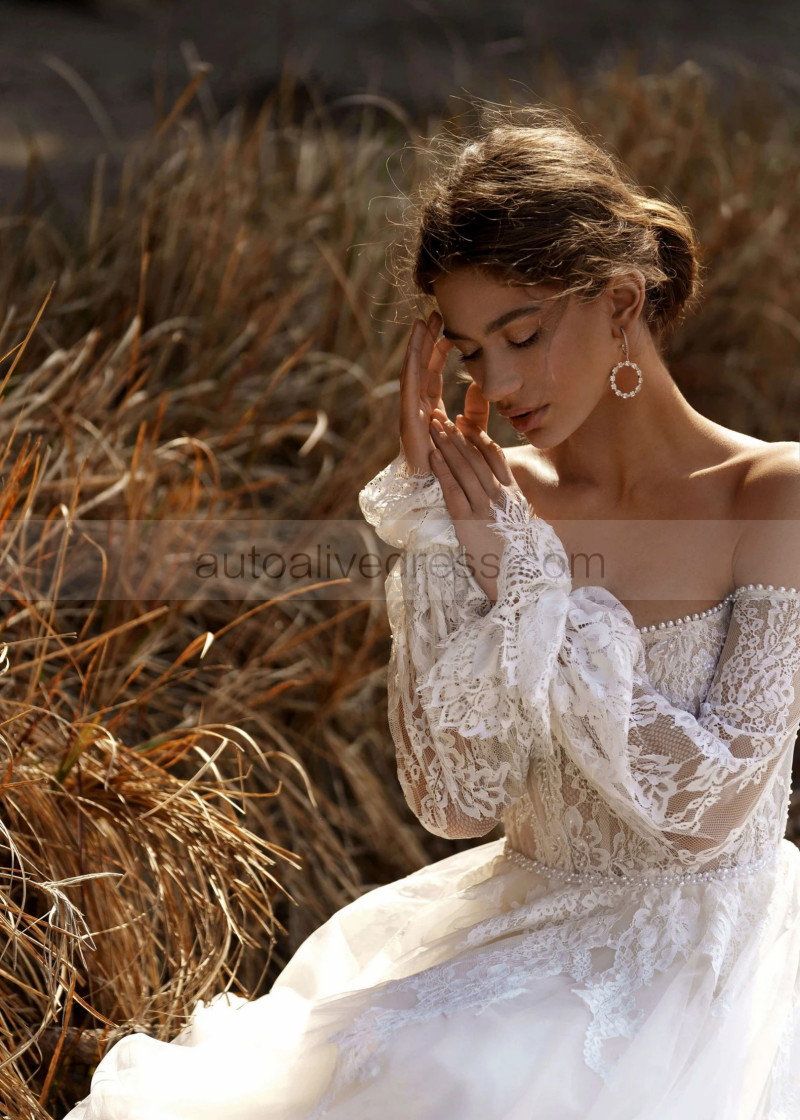 White Lace Tulle Pearls Embellished Stunning Wedding Dress