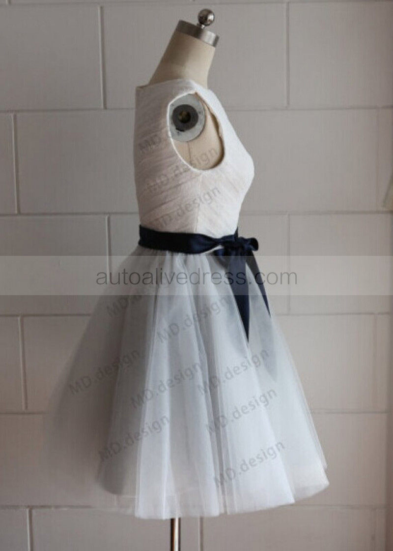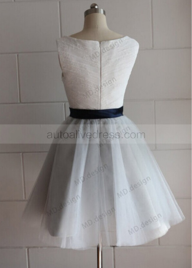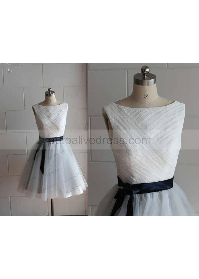 Boat Neck Ivory Lace Gray Tulle Short Bridesmaid Dress