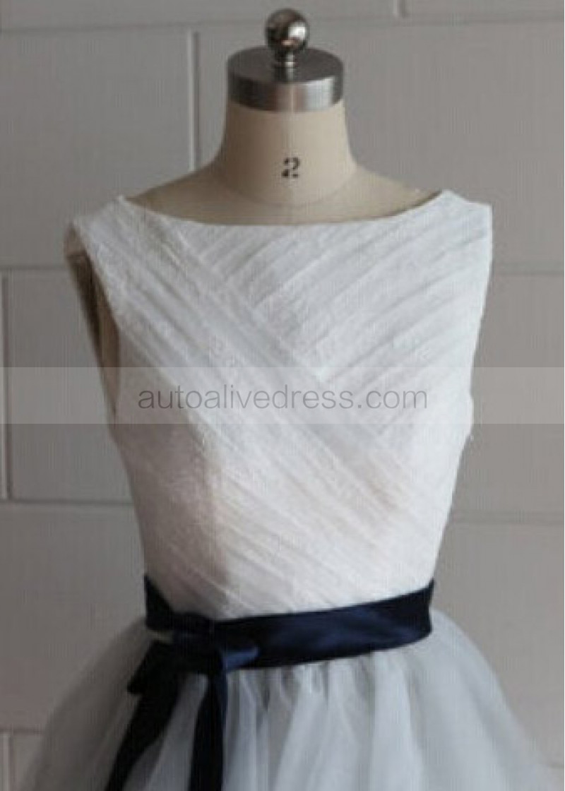 Shown ColorIvory Lace Gray Tulle With Navy Blue Sash