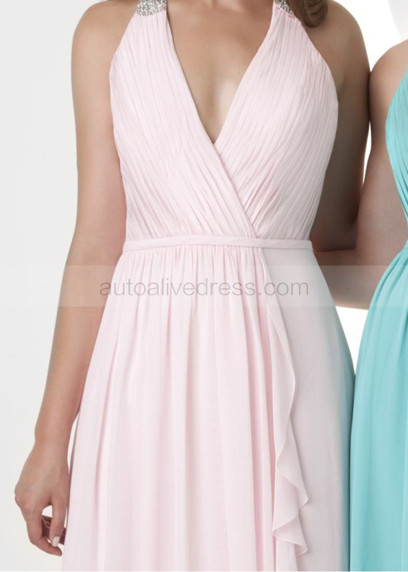 V Neck Beaded Halter Ruched Chiffon Bridesmaids Dress