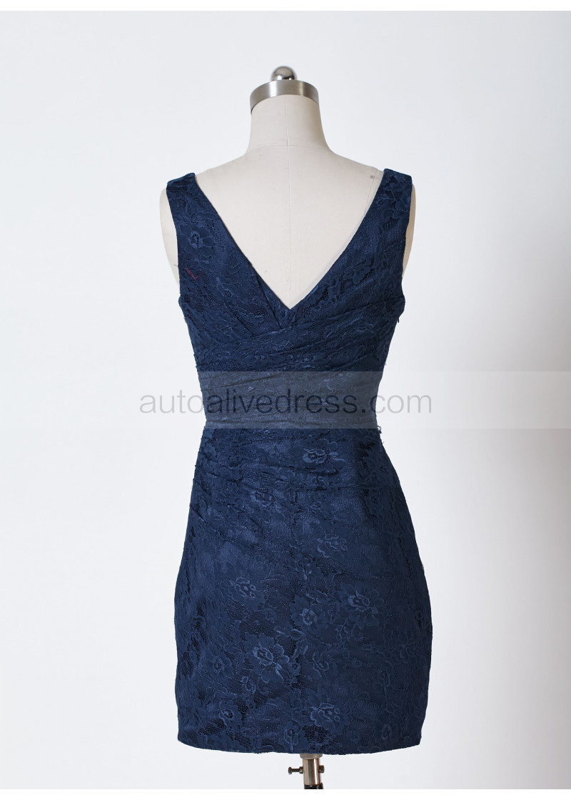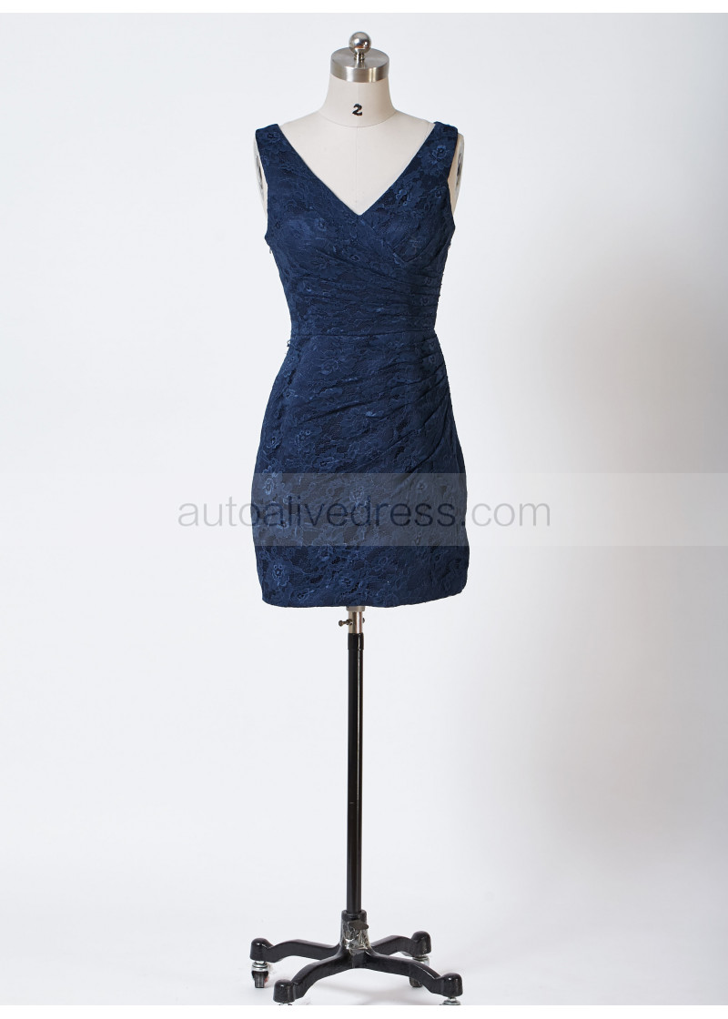 V Neck Navy Blue Pleated Lace Short Bridesmaid Dress