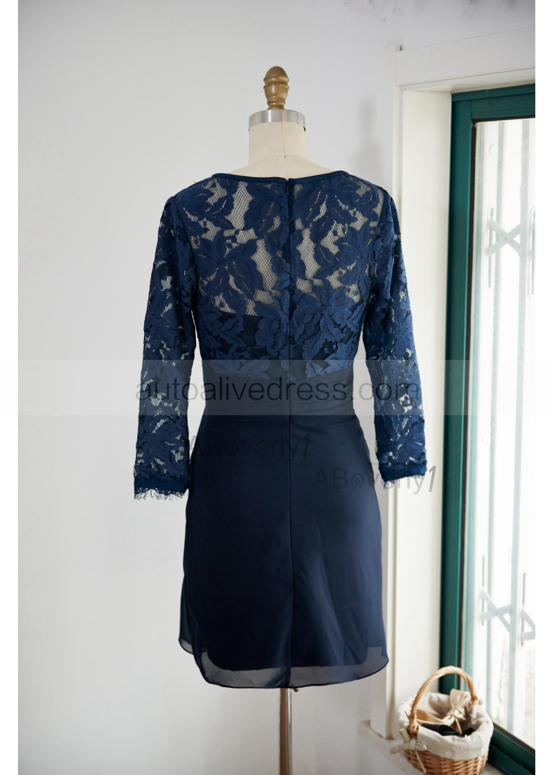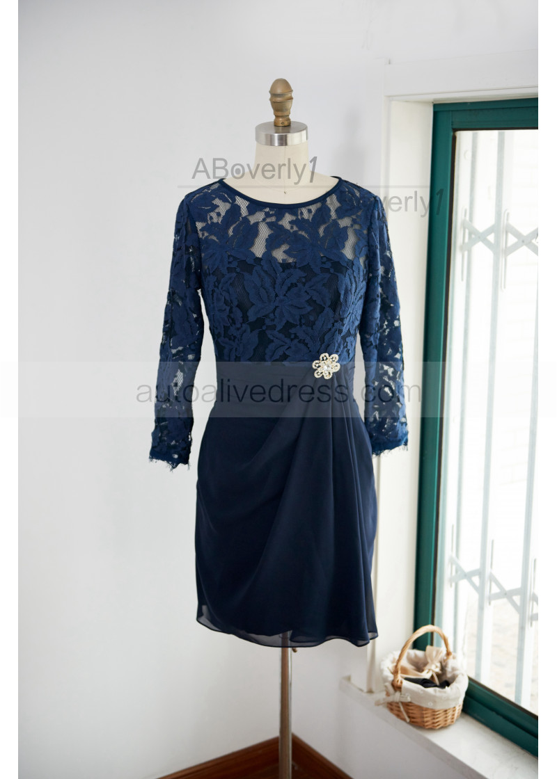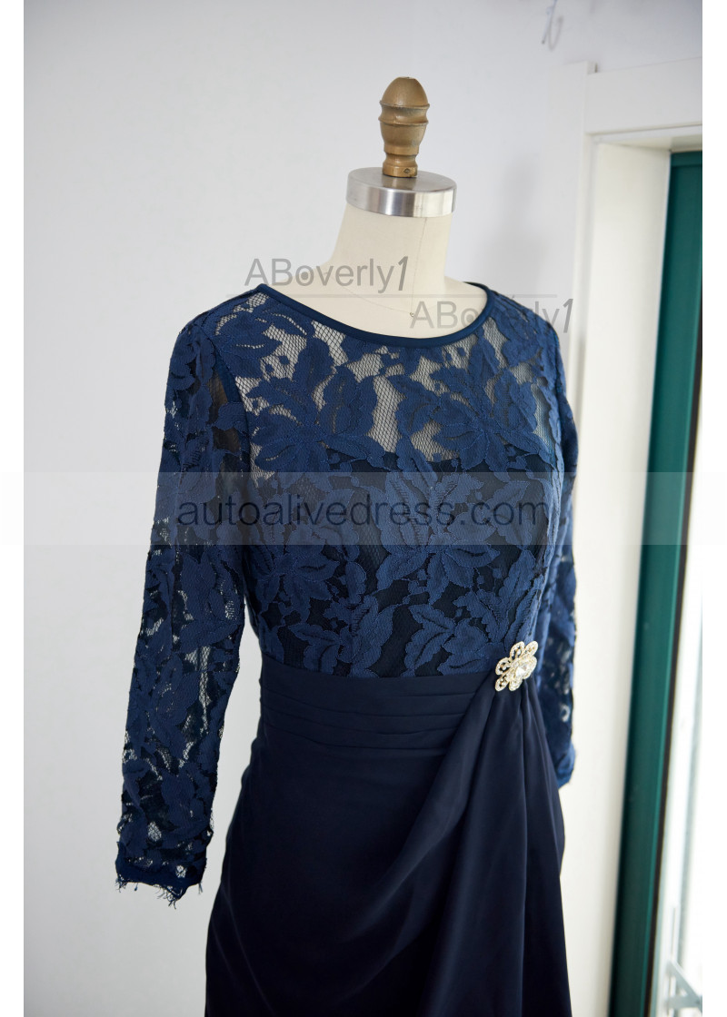 Long Sleeve Navy Blue Lace Chiffon Knee Length Mother Dress